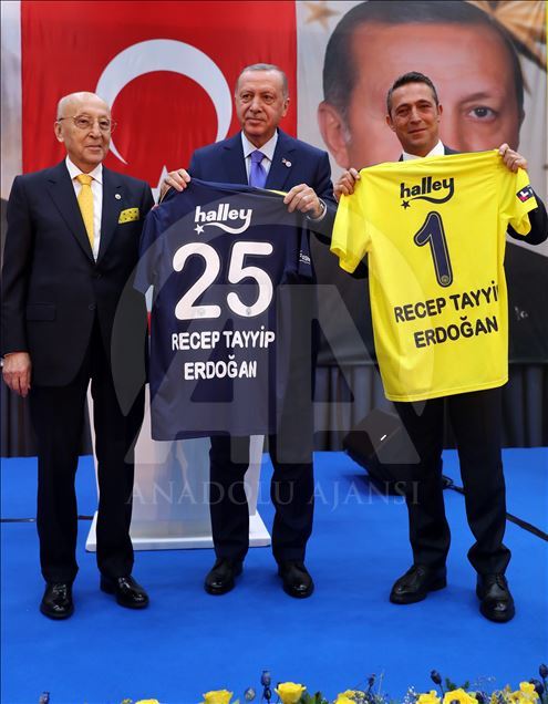 Türkiye Cumhurbaşkanı Recep Tayyip Erdoğan (ortada), Fenerbahçe Yüksek Divan Kurulu Olağan Toplantısı'na katıldı. Fenerbahçe Spor Kulübü Başkanı Ali Koç (sağda) ve Yüksek Divan Kurulu Başkanı Vefa Küçük (solda) Cumhurbaşkanı Erdoğan'a Fenerbahçe Spor Kulübü üyeliğinin 25. yılı anısına forma takdim etti. ( Cumhurbaşkanlığı / Murat Çetinmühürdar - Anadolu Ajansı )Cumhurbaşkanlığı / Murat Çetinmühürdar