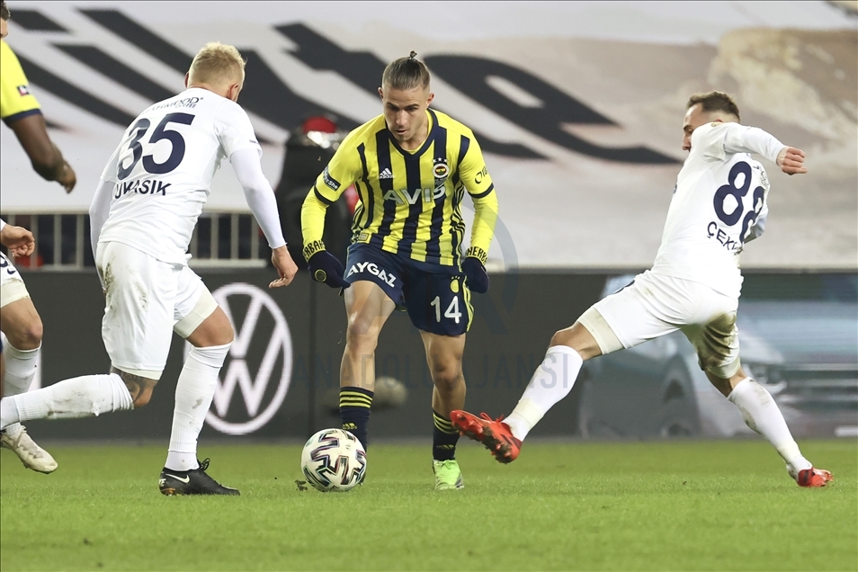 Fenerbahçe, Süper Lig'in 19. hafta maçında MKE Ankaragücü ile Ülker Stadı'nda karşılaştı. Fenerbahçeli oyuncu Dimitris Pelkas (14) ile MKE Ankaragücü futbolcuları Atila Turan (sağda) ve Daniel Lukasik (35) bir pozisyonda mücadele etti. ( Serhat Çağdaş - Anadolu Ajansı )Serhat Çağdaş