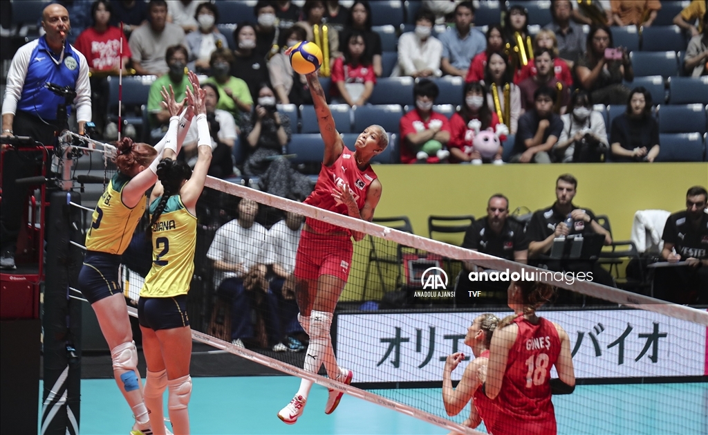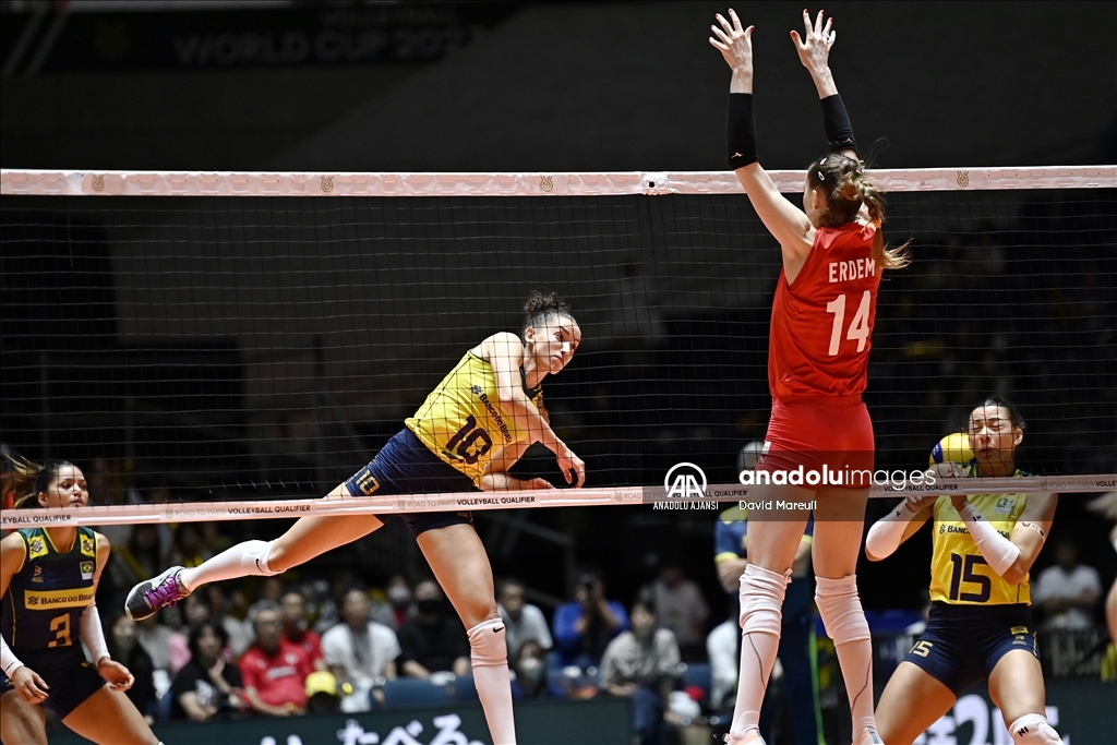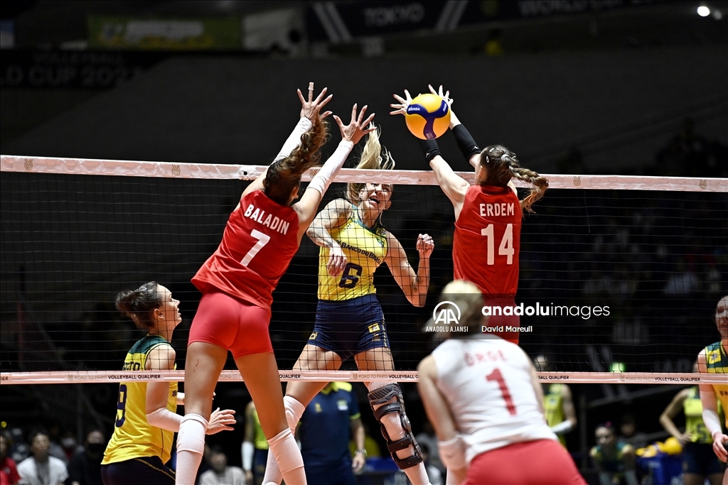 Türkiye Kadın Milli Voleybol takımı, 2024 Paris Olimpiyat elemeleri maçlarının beşinci gününde, Japonya'nın başkenti Tokyo'daki Yoyogi Ulusal Spor Salonu'nda Brezilya ile karşılaştı. Brezilyalı oyuncu Thaisa Daher de Menezes (6), rakipleri Hande Baladin (7), Eda Erdem Dündar (14) ve Gizem Örge (1) ile mücadele etti. ( David Mareuil - Anadolu Ajansı )David Mareuil