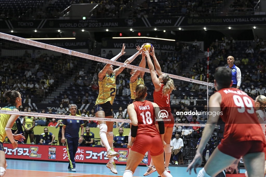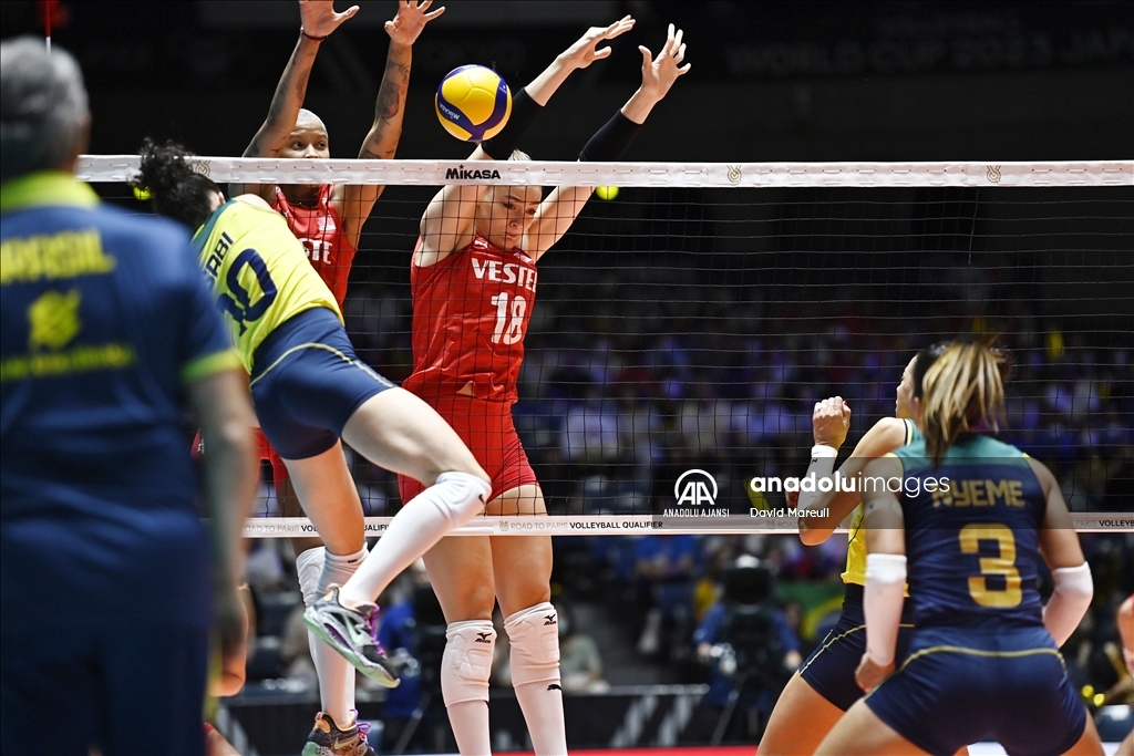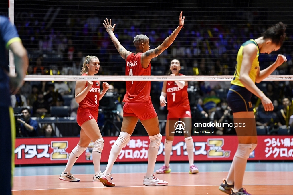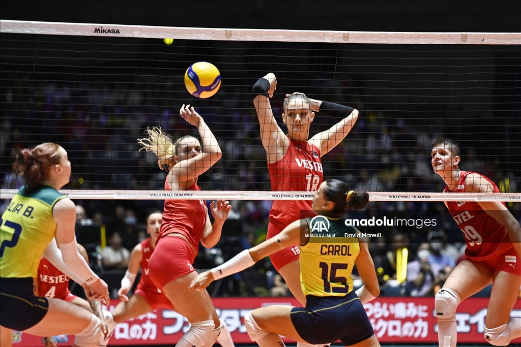 Türkiye Kadın Milli Voleybol takımı, 2024 Paris Olimpiyat elemeleri maçlarının beşinci gününde, Japonya'nın başkenti Tokyo'daki Yoyogi Ulusal Spor Salonu'nda Brezilya ile karşılaştı. Brezilyalı oyuncular Antonela Fortuna (15) ve Julia Isabelle Bergmann (17), rakipleri Zehra Güneş (18), Cansu Özbay (3) and Ebrar Karakurt (99) ile mücadele etti. ( David Mareuil - Anadolu Ajansı )David Mareuil