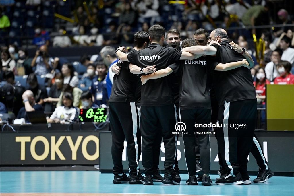 Türkiye Kadın Milli Voleybol takımı, 2024 Paris Olimpiyat elemeleri maçlarının beşinci gününde, Japonya'nın başkenti Tokyo'daki Yoyogi Ulusal Spor Salonu'nda Brezilya ile karşılaştı. Milli takım teknik direktörü Daniele Santarelli ve ekibi galibiyet sonrası sevinç yaşadı. ( David Mareuil - Anadolu Ajansı )David Mareuil