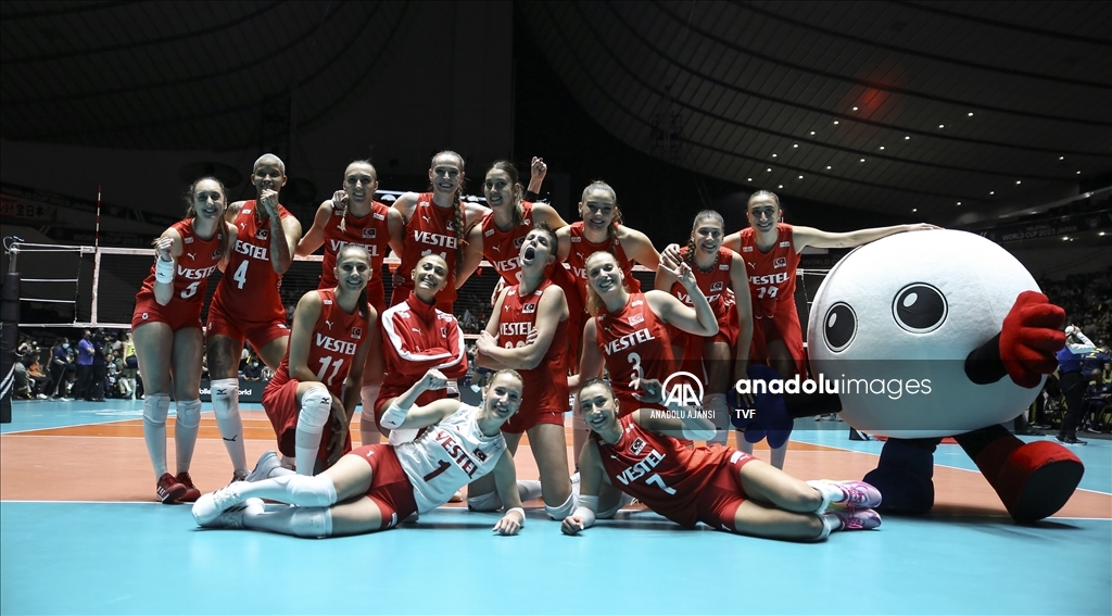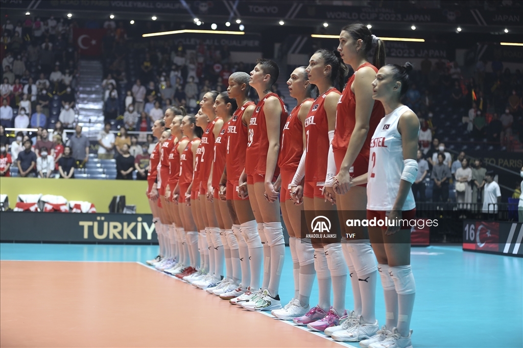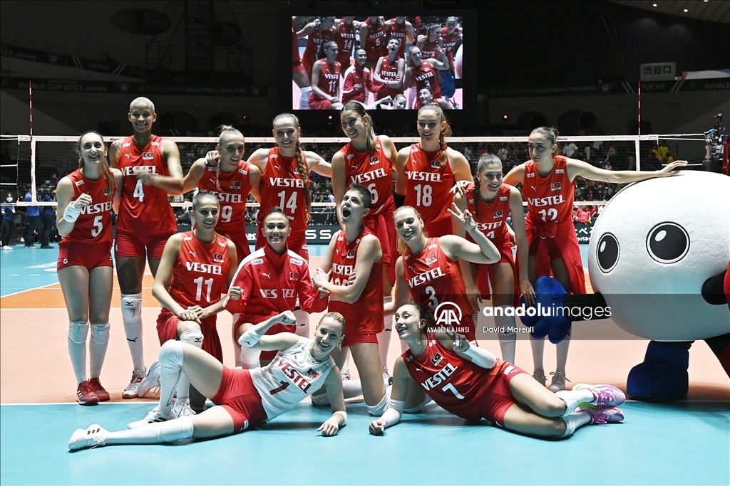 Türkiye Kadın Milli Voleybol takımı, 2024 Paris Olimpiyat elemeleri maçlarının beşinci gününde, Japonya'nın başkenti Tokyo'daki Yoyogi Ulusal Spor Salonu'nda Brezilya ile karşılaştı. Milli oyuncular, galibiyet sonrası poz verdi. ( David Mareuil - Anadolu Ajansı )David Mareuil