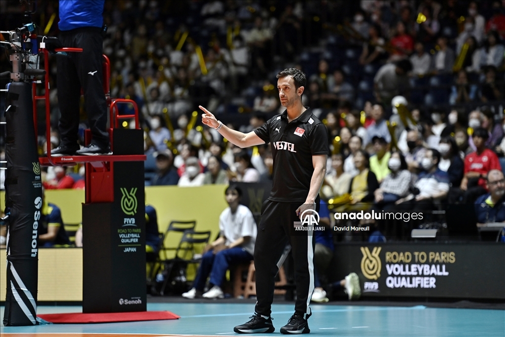 Türkiye Kadın Milli Voleybol takımı, 2024 Paris Olimpiyat elemeleri maçlarının beşinci gününde, Japonya'nın başkenti Tokyo'daki Yoyogi Ulusal Spor Salonu'nda Brezilya ile karşılaştı. Milli takım teknik direktörü Daniele Santraelli, oyuncularına taktik verdi. ( David Mareuil - Anadolu Ajansı )David Mareuil