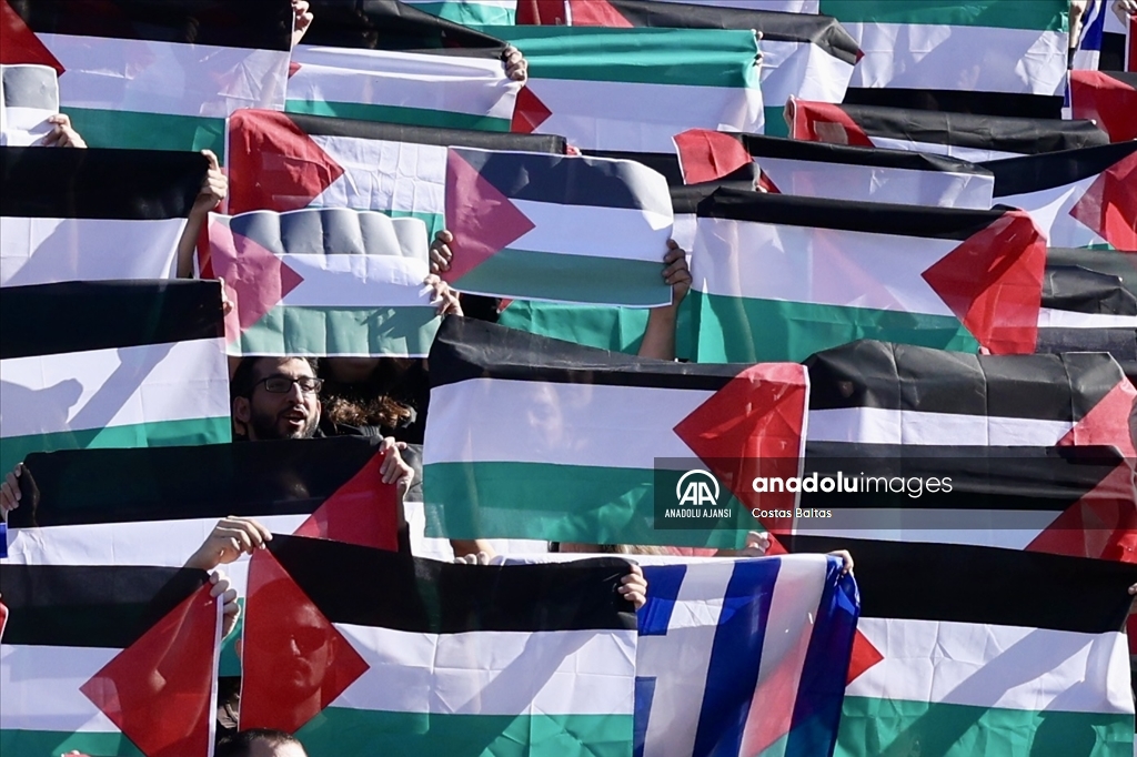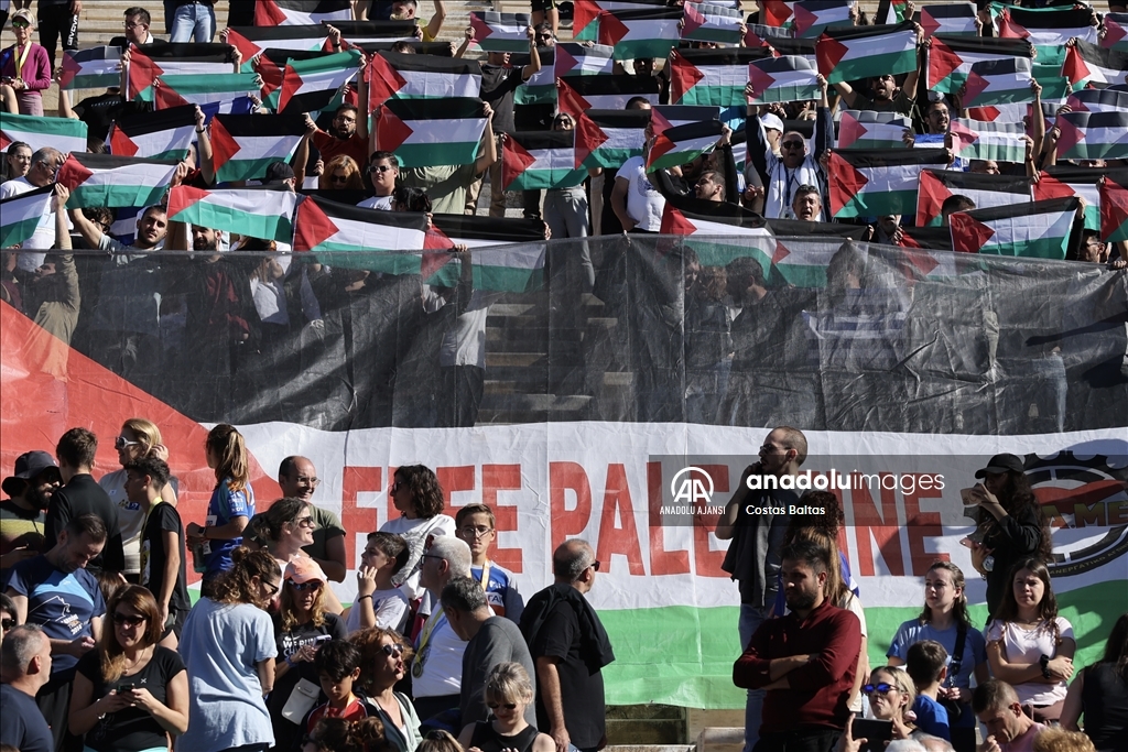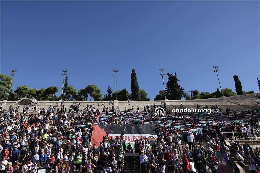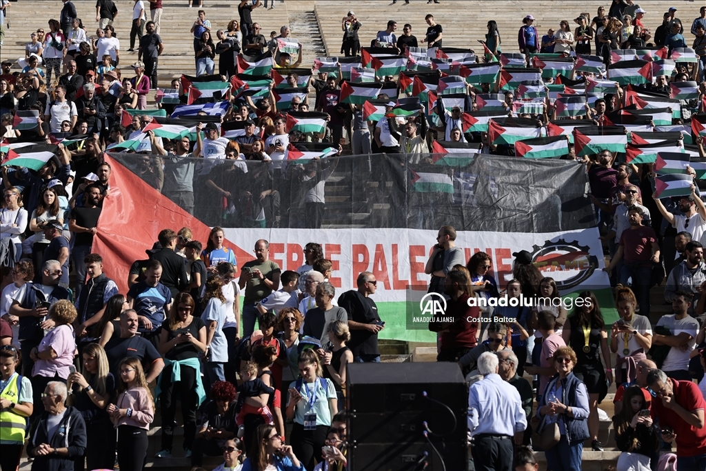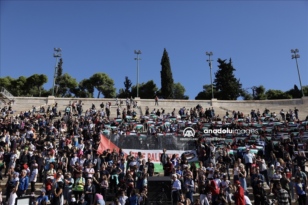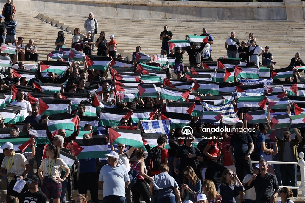 Yunanistan'nın başkenti Atina'da toplanan vatandaşlar Filistin'e destek gösterisi düzenledi. Atina Klasik Maratonuna katılan göstericiler, İsrail'in saldırılarına karşı Filistin'e destek mesajı verdi.