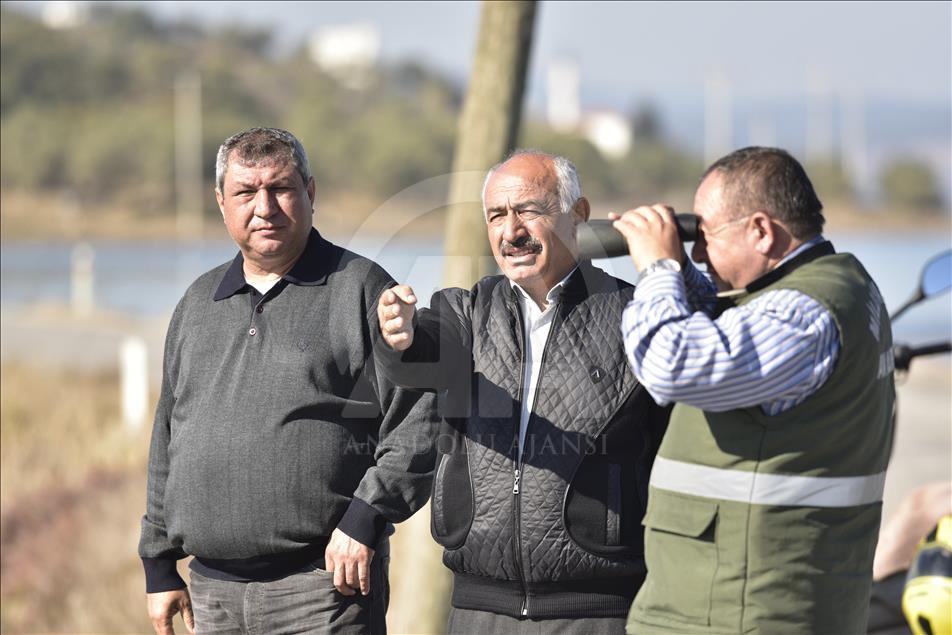 Flamingo ve pelikanların Muğla'nın Bodrum ilçesine göç yolculuğu başladı. Muhtar Köksal (ortada), ormancıların bölgede avlanan kişileri yakalamak için mücadele verdiğini belirten Köksal, sulak alan içerisindeki kaçak yapılaşmanın da önlenmesi gerektiğini dile getirdi. ( Ali Ballı - Anadolu Ajansı )Ali Ballı