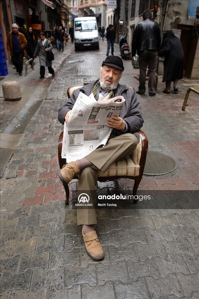 Ara Güler, Asmalı Mescit semtinde bir sokakta sokak ortasında gazete okuyor. (Nezih Tavlaş - 29.01.2009) Nezih Tavlaş