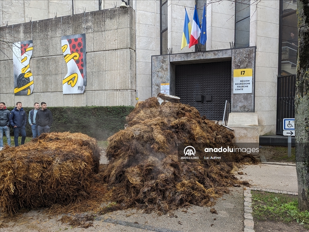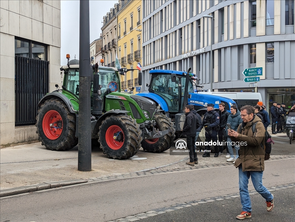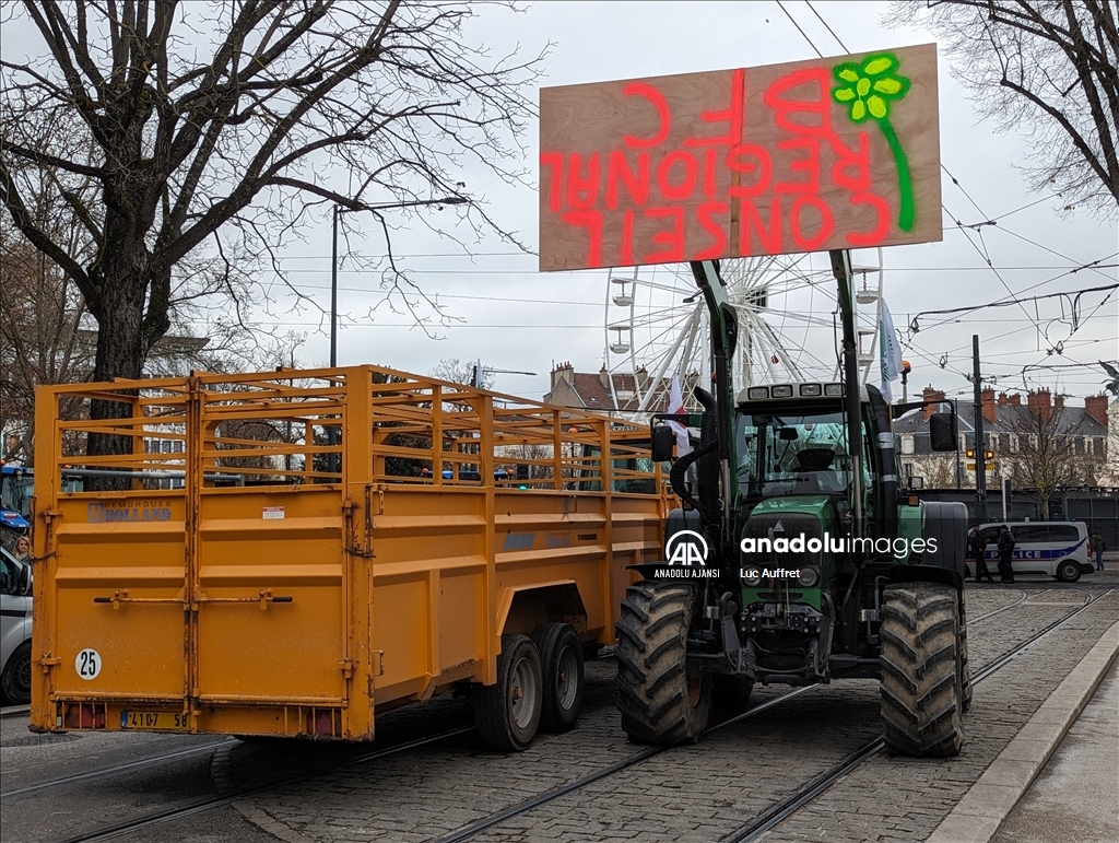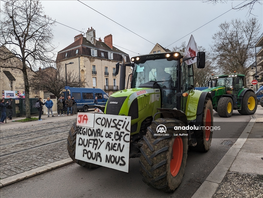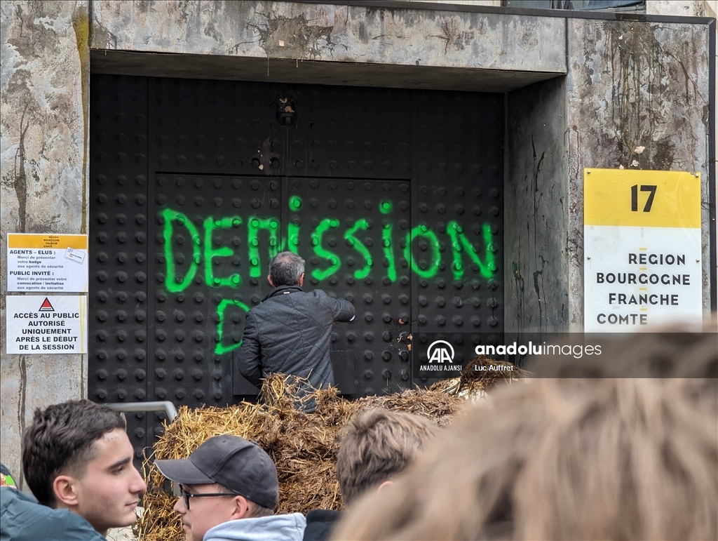 Fransa'nın Dijon kentindeki çiftçiler Bölgesel Konsey'i protesto etti. Bölgesel Konsey önünde toplanan yüzlerce çiftçi, 80'den fazla traktör ile Avrupa sübvansiyonlarının ödenmesindeki gecikmeleri kınamak amacıyla protesto düzenledi. Ülke çapında çiftçiler tarafından devam eden protestolar, tarım politikalarını ve yüksek vergileri pankartlarla protesto etti. ( Luc Auffret - Anadolu Ajansı )Luc Auffret