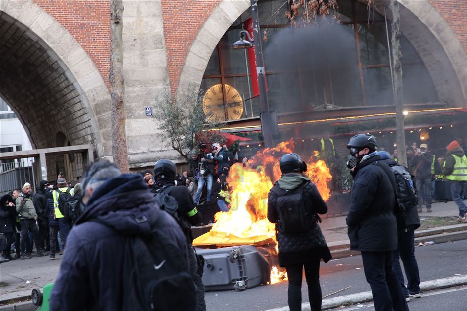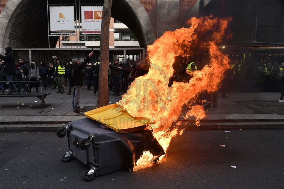 Fransa'nın başkenti Paris'te Cumhurbaşkanı Emmanuel Macron yönetiminin emeklilik reformunu protesto etmek için gösteri düzenlendi. Diderot Bulvarı'ndan Place de la Bastille'e doğru yürüyen göstericiler arasında farklı sendika üyeleri ile sarı yelekliler de yer aldı. Bazı göstericiler, eyleme müdahale eden güvenlik güçlerine karşılık bir çöp kutusunu ateşe verdi. ( Julien Mattia - Anadolu Ajansı )Julien Mattia