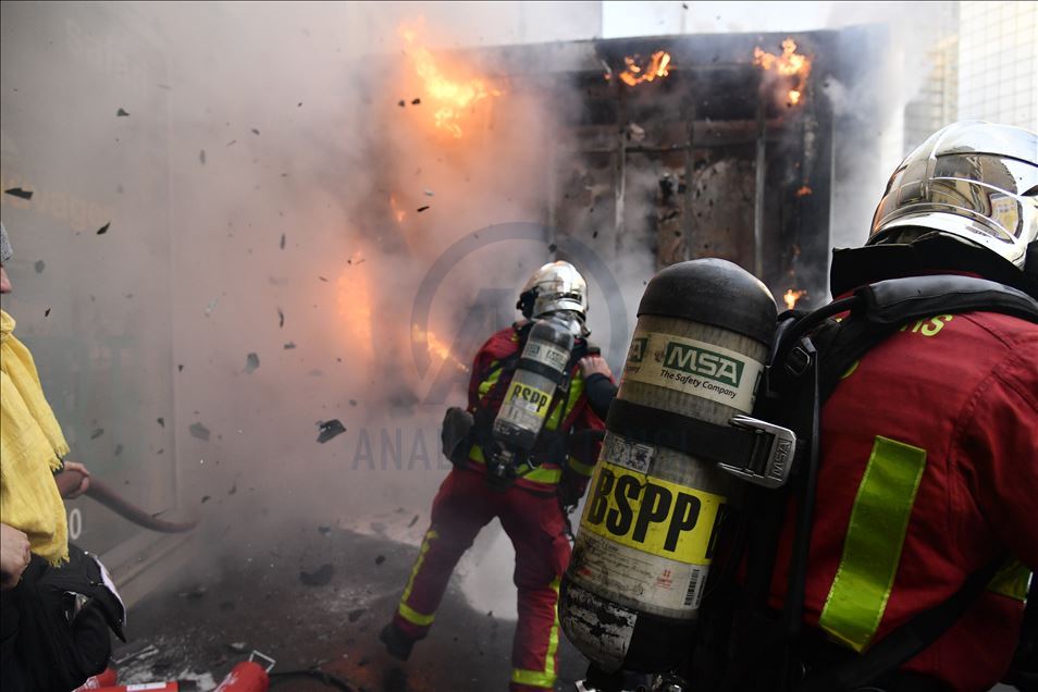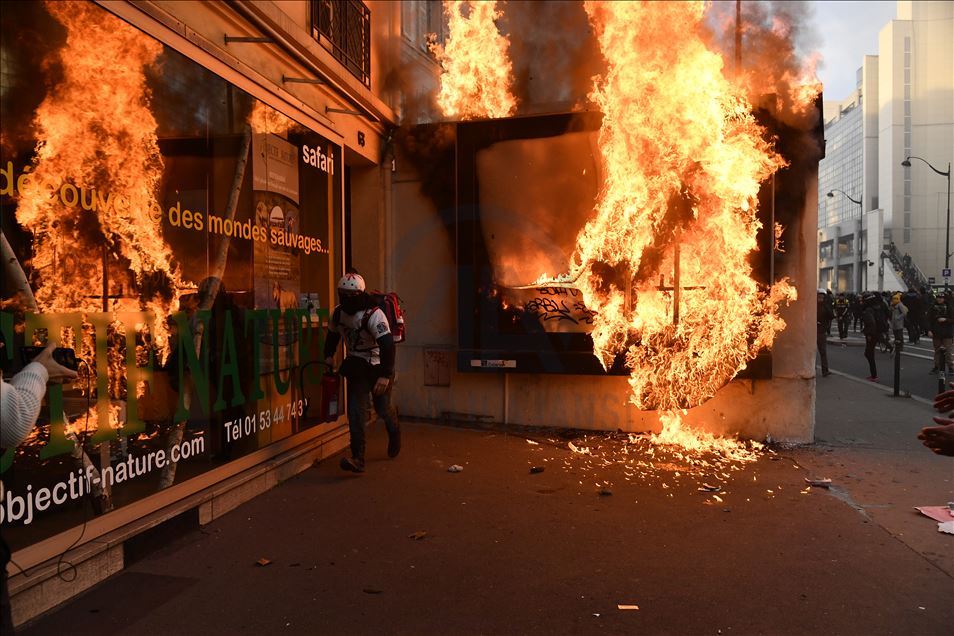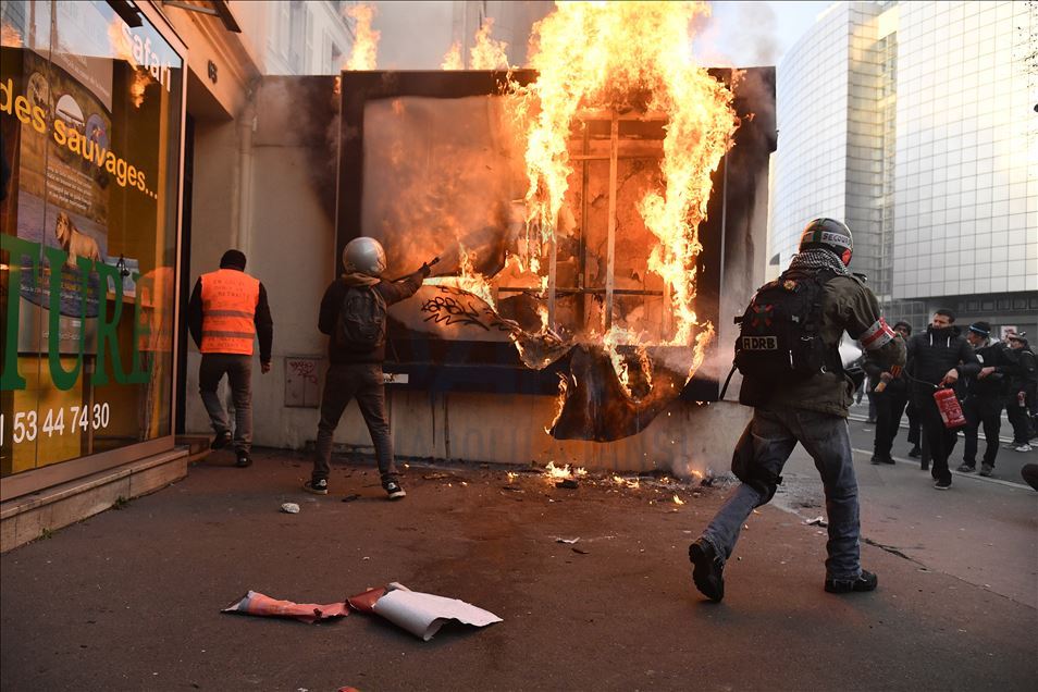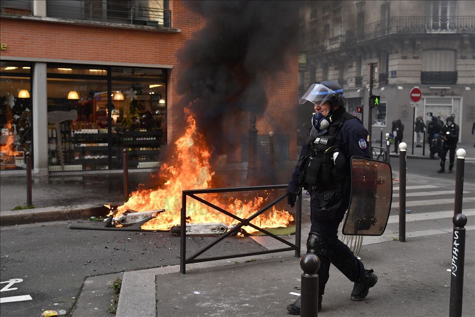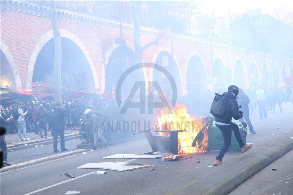 Fransa'nın başkenti Paris'te Cumhurbaşkanı Emmanuel Macron yönetiminin emeklilik reformunu protesto etmek için gösteri düzenlendi. Bazı göstericiler, gösteriye müdahale eden güvenlik güçlerine çöp kutularını yakarak karşılık verdi. ( Dursun Aydemir - Anadolu Ajansı )Dursun Aydemir
