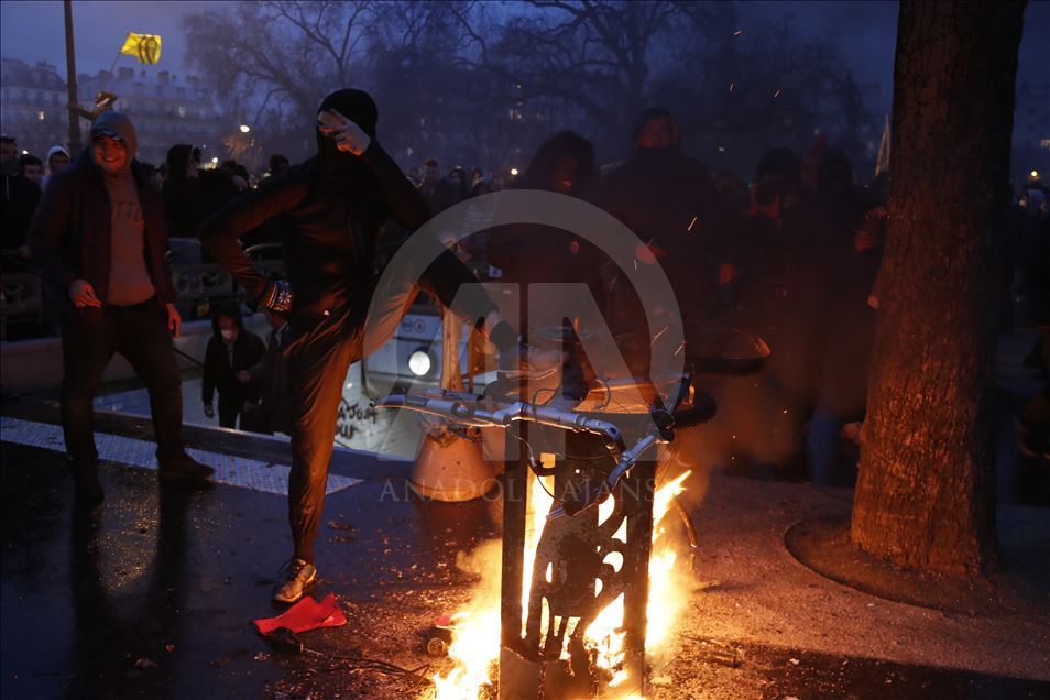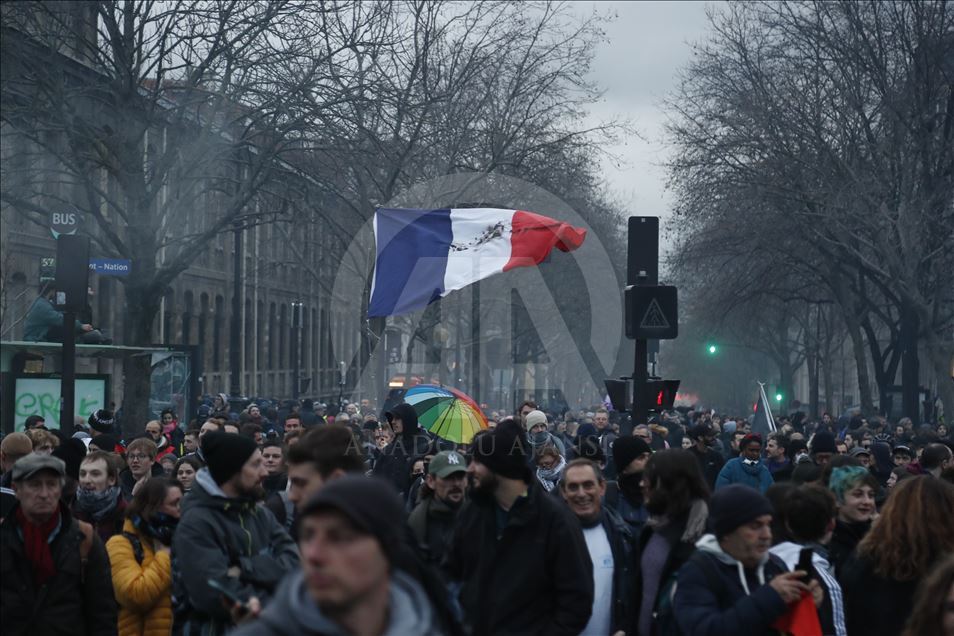 Fransa'da Cumhurbaşkanı Emmanuel Macron yönetiminin emeklilik reformuna karşı başlatılan grevler 13. gününe girdi. Grevler nedeniyle Paris'te ve çeşitli kentlerde sağlık, kamu ve ulaşım hizmetlerinde ciddi aksamalar yaşanıyor. Polisle göstericiler arasında çıkan arbedede bir gösterici yaralandı. ( Zakaria Abdelkafi - Anadolu Ajansı )Zakaria Abdelkafi
