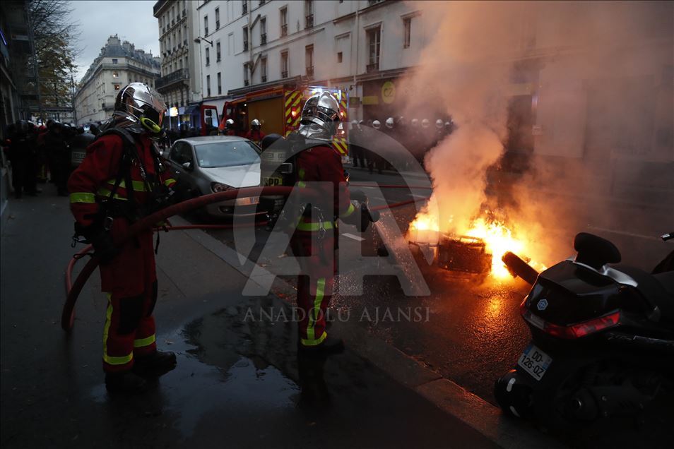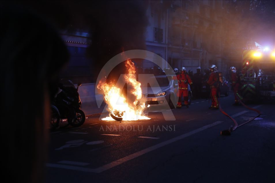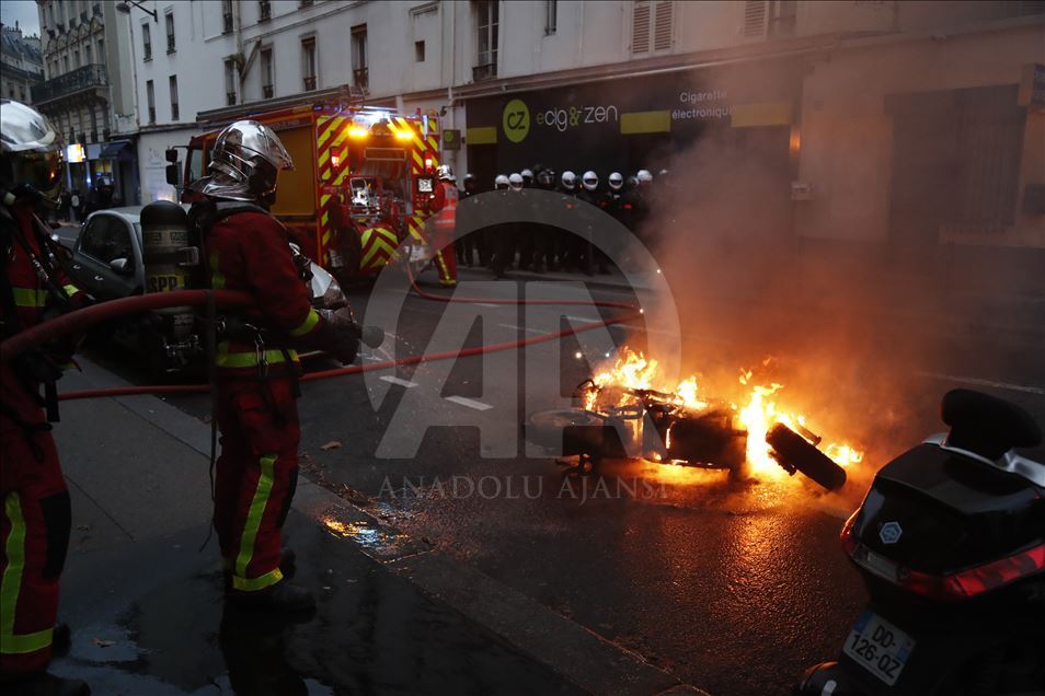 Fransa'da Cumhurbaşkanı Emmanuel Macron yönetiminin emeklilik reformuna karşı başlatılan grevler 13. gününe girdi. Grevler nedeniyle Paris'te ve çeşitli kentlerde sağlık, kamu ve ulaşım hizmetlerinde ciddi aksamalar yaşanıyor. İtfaiye ekipleri göstericilerin ateşe verdiği bir motorsikleti söndürdü. ( Zakaria Abdelkafi - Anadolu Ajansı )Zakaria Abdelkafi
