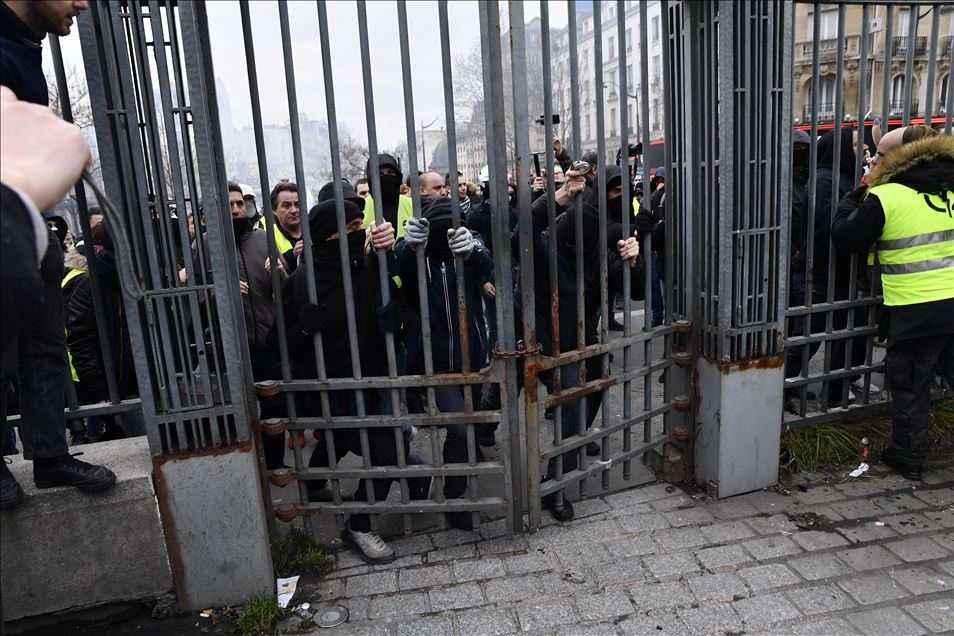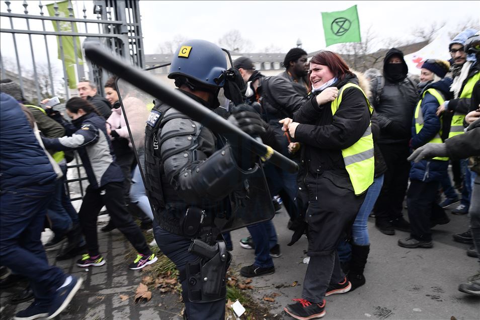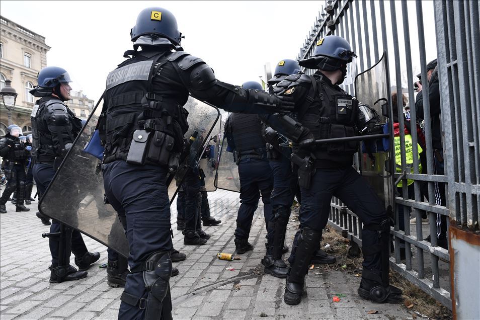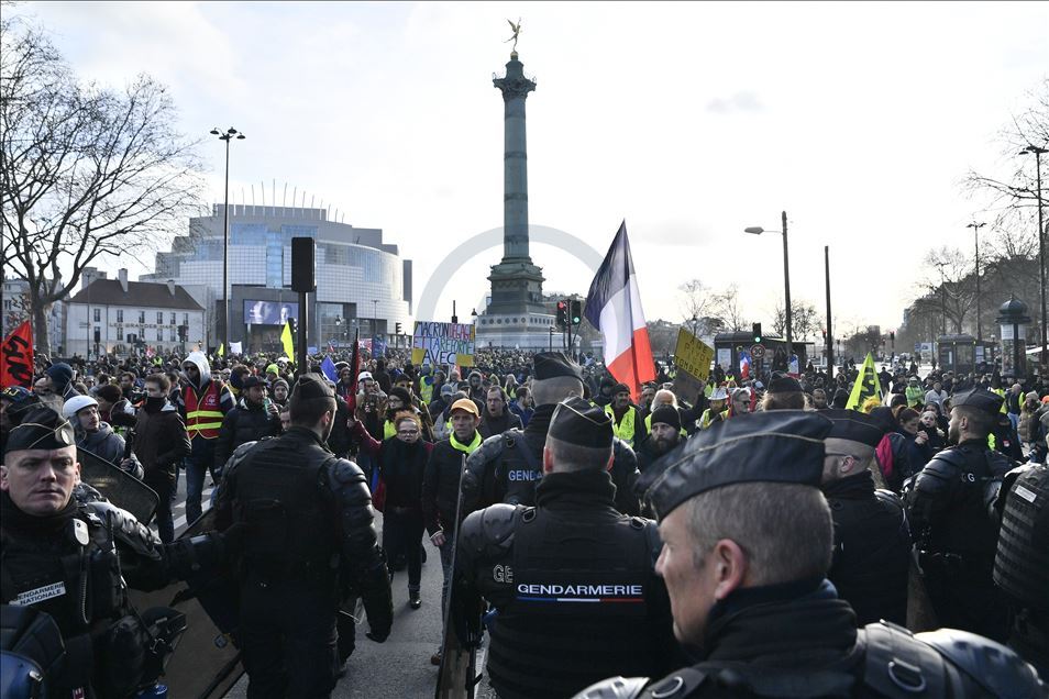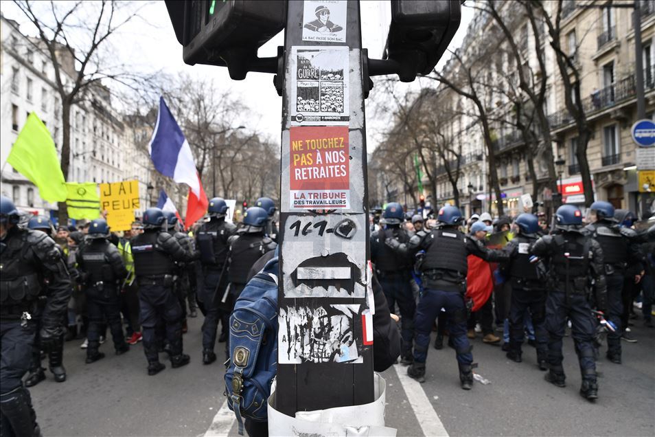 Fransa'da Cumhurbaşkanı Emmanuel Macron yönetiminin emeklilik reformuna karşı başlatılan grevler 31'inci gününe girdi. Genel Emek Konfederasyonu'nun (CGT) çağrısıyla başkent Paris'te düzenlenen gösteriye sarı yelekliler de katıldı. Gösteride, güvenlik önlemleri alındı. ( Julien Mattia - Anadolu Ajansı )Julien Mattia