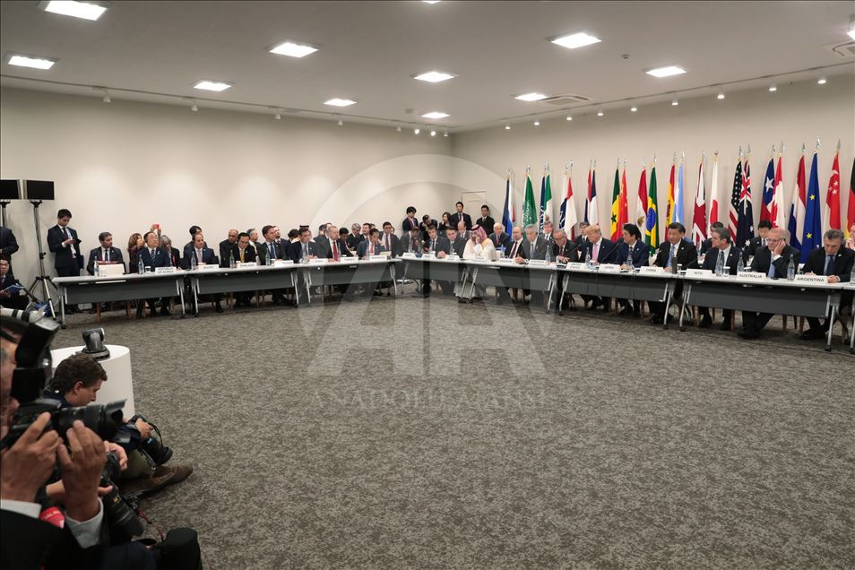 Japonya’nın ev sahipliğinde Osaka’da iki gün sürecek G20 Liderler Zirvesi, INTEX Osaka Fuar Merkezi’nde başladı. Liderler, “Küresel Ekonomi, Ticaret ve Yatırımlar” temasıyla düzenlenen zirvenin ilk oturumuna katıldı. Oturuma Japonya Başbakanı Şinzo Abe, Cumhurbaşkanı Recep Tayyip Erdoğan, ABD Başkanı Donald Trump, İngiltere Başbakanı Theresa May, Rusya Devlet Başkanı Vladimir Putin ve Arjantin Cumhurbaşkanı Mauricio Macri de katıldı. ( Cumhurbaşkanlığı / Murat Çetinmühürdar - Anadolu Ajansı )Cumhurbaşkanlığı / Murat Çetinmühürdar