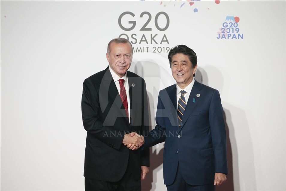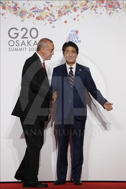 Türkiye Cumhurbaşkanı Recep Tayyip Erdoğan (solda) , G20 Osaka Liderler Zirvesi'nin resmi açılış törenine katıldı. Cumhurbaşkanı Erdoğan, Japonya Başbakanı Şinzo Abe tarafından karşılandı. ( Metin Aktas - Anadolu Ajansı )Metin Aktas