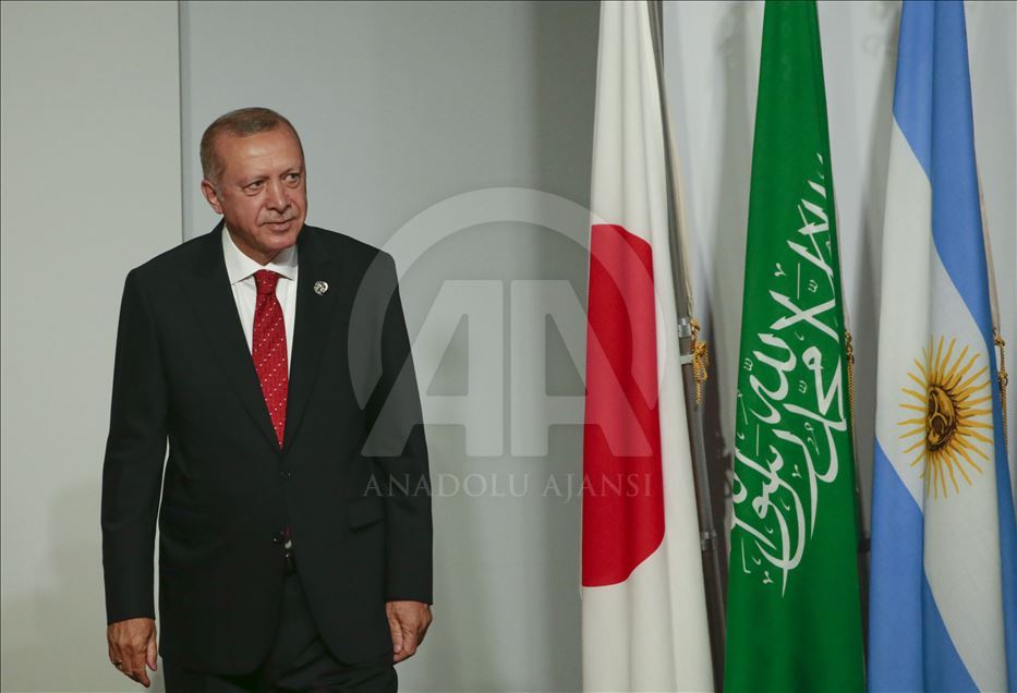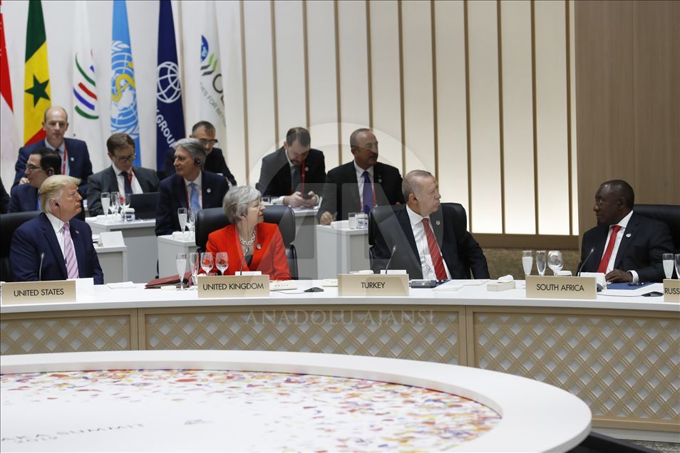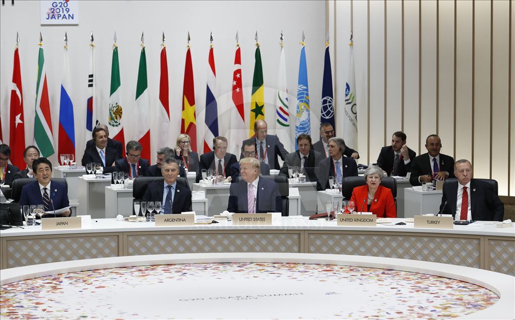 Japonya’nın ev sahipliğinde Osaka’da iki gün sürecek G20 Liderler Zirvesi, INTEX Osaka Fuar Merkezi’nde başladı. Liderler, “Küresel Ekonomi, Ticaret ve Yatırımlar” temasıyla düzenlenen zirvenin ilk oturumuna katıldı. Oturuma Cumhurbaşkanı Recep Tayyip Erdoğan, ABD Başkanı Donald Trump, İngiltere Başbakanı Theresa May ve Arjantin Cumhurbaşkanı Mauricio Macri de katıldı. ( Cumhurbaşkanlığı / Cem Öksüz - Anadolu Ajansı )Cumhurbaşkanlığı / Cem Öksüz