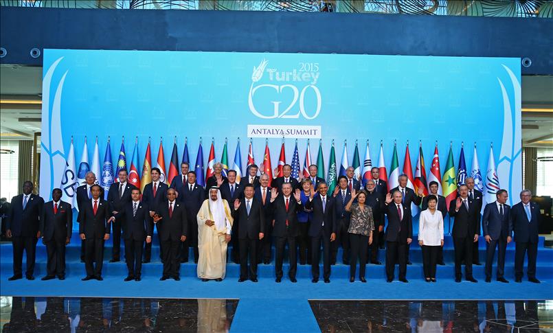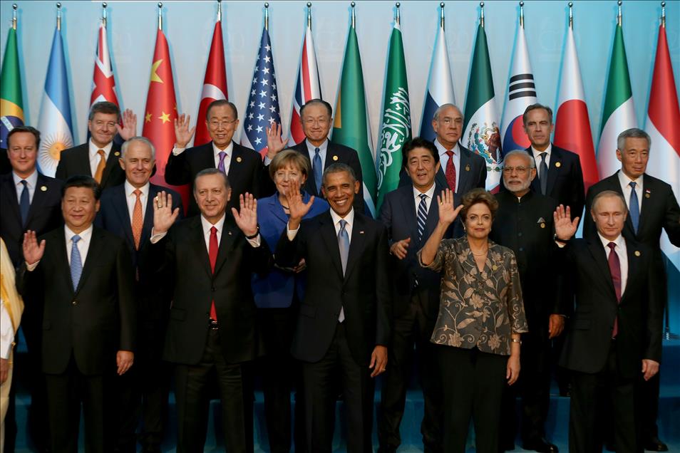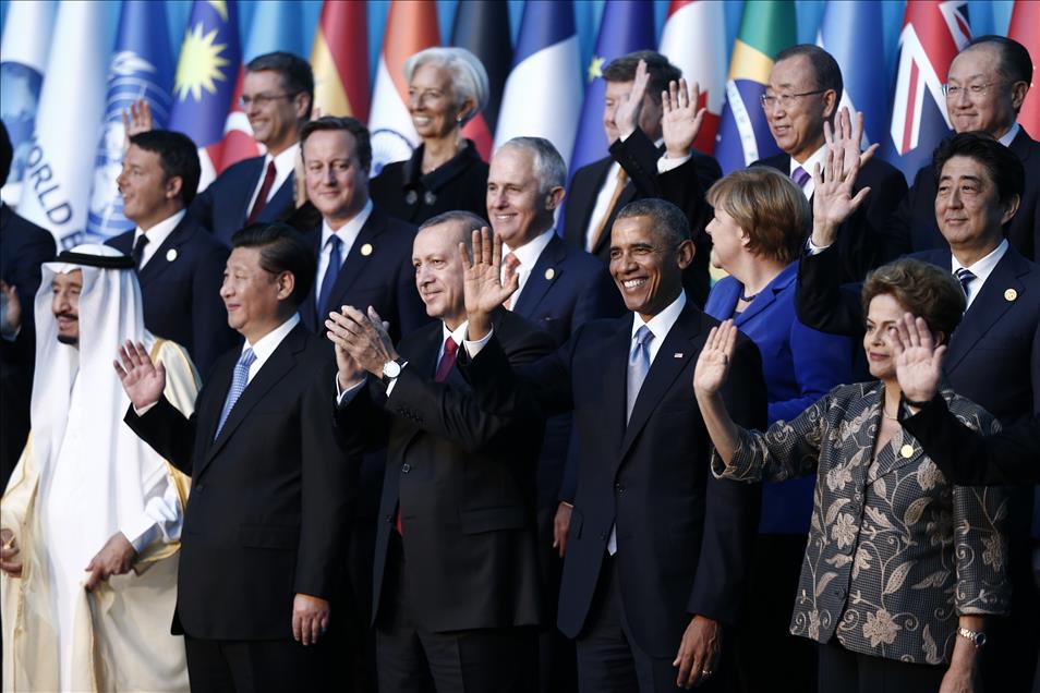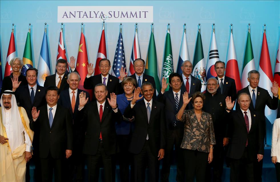 Türkiye’nin ev sahipliğinde Antalya’da gerçekleştirilen G20 Liderler Zirvesi kapsamında üye ülkeler ile davetli ülkelerin devlet ve hükümet başkanları ve uluslararası örgütlerin yöneticileri, toplantılardan önce aile fotoğrafı çektirdi. Fotoğrafta; (Ön sıra – soldan sağa) Suudi Arabistan Kralı Selman bin Abdülaziz Al Suud, Çin Halk Cumhuriyeti Devlet Başkanı Xi Jinping, Cumhurbaşkanı Recep Tayyip Erdoğan, ABD Başkanı Barack Obama, Brezilya Cumhurbaşkanı Dilma Rousseff, (Orta sıra – soldan saga) İtalya Başbakanı Matteo Renzi, İngiltere Başbakanı David Cameron, Avustralya Başbakanı Malcolm Turnbull, Almanya Başbakanı Angela Merkel, Japonya Başbakanı Shinzo Abe, (Arka sıra – soldan saga) Dünya Ticaret Örgütü Genel Direktörü Roberto Azevedo, Uluslararası Para Fonu (IMF) Başkanı Christine Lagarde, Uluslararası Çalışma Örgütü (ILO) Genel Direktörü Guy Ryder, BM Genel Sekreteri Ban Ki-mun, Dünya Bankası Başkanı Jim Yong Kim, yer aldı. (Aykut Ünlüpınar - Anadolu Ajansı)Aykut Ünlüpınar
