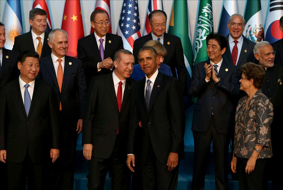 Türkiye’nin ev sahipliğinde Antalya’da gerçekleştirilen G20 Liderler Zirvesi kapsamında üye ülkeler ile davetli ülkelerin devlet ve hükümet başkanları ve uluslararası örgütlerin yöneticileri, toplantılardan önce aile fotoğrafı çektirdi. Fotoğrafta, Cumhurbaşkanı Recep Tayyip Erdoğan (sol önde) ve ABD Başkanı Barack Obama (sağ önde), Almanya Başbakanı Angela Merkel, BM Genel Sekreteri Ban Ki-mun ve Dünya Bankası Başkanı Jim Yong Kim de yer aldı. (Berk Özkan - Anadolu Ajansı)Berk Özkan