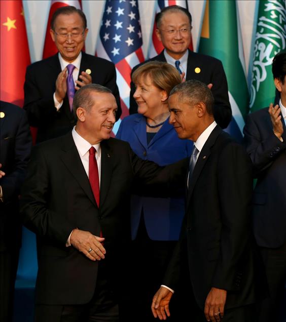 Türkiye’nin ev sahipliğinde Antalya’da gerçekleştirilen G20 Liderler Zirvesi kapsamında üye ülkeler ile davetli ülkelerin devlet ve hükümet başkanları ve uluslararası örgütlerin yöneticileri, toplantılardan önce aile fotoğrafı çektirdi. Fotoğrafta, Cumhurbaşkanı Recep Tayyip Erdoğan (solda), ABD Başkanı Barack Obama (sağda) ve Almanya Başbakanı Angela Merkel de yer aldı. (Berk Özkan - Anadolu Ajansı)Berk Özkan
