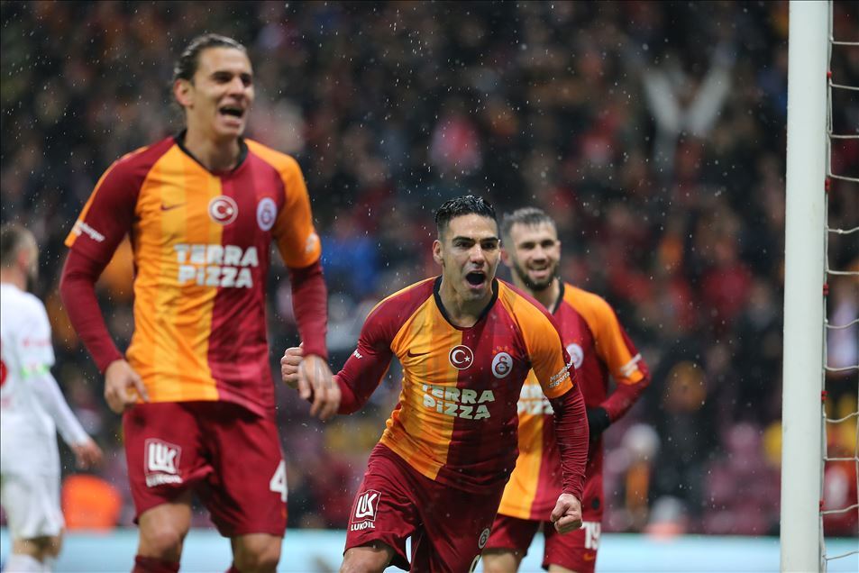 Galatasaray, Süper Lig'in 17. haftasında Antalyaspor ile karşılaştı. Galatasaraylı futbolcu Radamel Falcao (9) kullandığı penaltı atışını gol yaptı. Falcao ve takım arkadaşları, gol sonrası sevinç yaşadı. ( İsa Terli - Anadolu Ajansı )İsa Terli