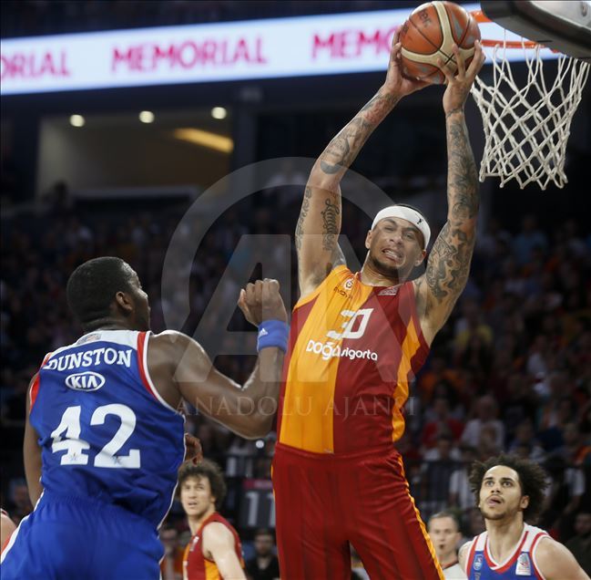 Tahincioğlu Basketbol Süper Ligi play-off yarı final serisi üçüncü maçında Galatasaray Doğa Sigorta ile Anadolu Efes, Sinan Erdem Spor Salonu’nda karşılaştı. Bir pozisyonda Galatasaray Doğa Sigortalı basketbolcu Zachary Augusta (sağda) ile Anadolu Efes oyuncusu Bryant Dunston (ortada) mücadele etti. ( Erhan Elaldı - Anadolu Ajansı )Erhan Elaldı