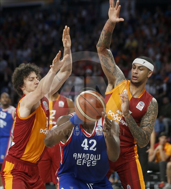 Tahincioğlu Basketbol Süper Ligi play-off yarı final serisi üçüncü maçında Galatasaray Doğa Sigorta ile Anadolu Efes, Sinan Erdem Spor Salonu’nda karşılaştı. Bir pozisyonda Galatasaray Doğa Sigortalı basketbolcu Zachary Auguste (30) ile Anadolu Efes oyuncuları Bryant Dunston (42) ve James Anderson (sağ 2) mücadele etti. ( Erhan Elaldı - Anadolu Ajansı )Erhan Elaldı