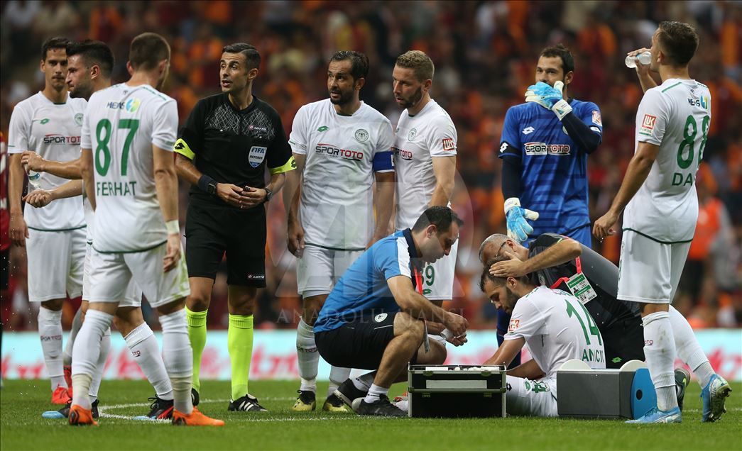 Galatasaray, Süper Lig'in 2. haftasında Konyaspor ile Türk Telekom Stadı'nda karşılaştı. Kafasına darbe alan Konyasporlu oyuncu Marin Anicic (ortada), bir süre oyun dışında kaldıktan sonra maça devam etti. ( İslam Yakut - Anadolu Ajansı )İslam Yakut