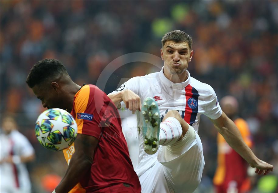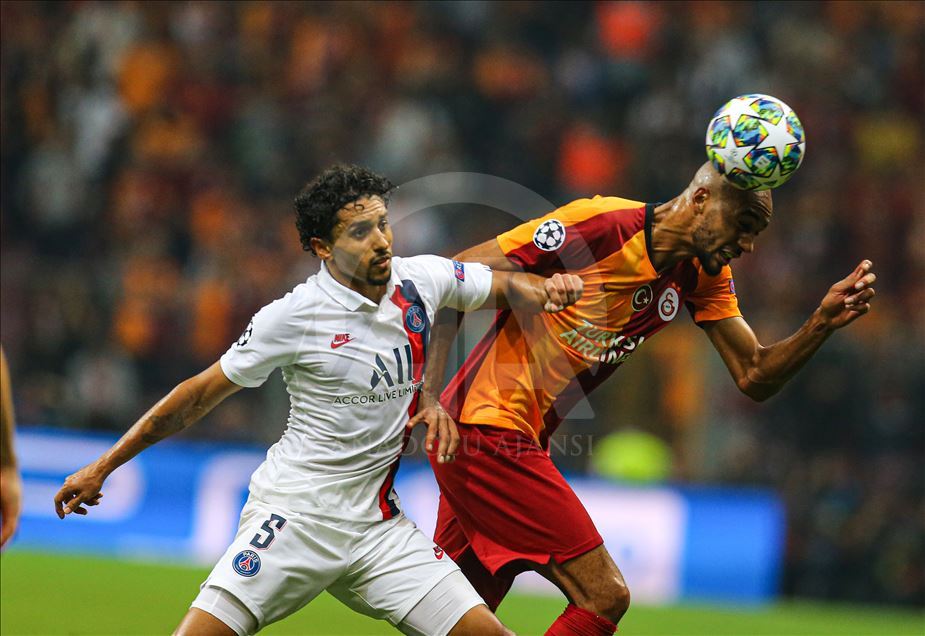 UEFA Şampiyonlar Ligi'nde Galatasaray, A Grubu'nda Fransa'nın Paris Saint-German ekibiyle Türk Telekom Stadı’nda karşılaştı. Bir pozisyonda Galatasaraylı oyuncu Steven Nzonzi (sağda) ile Paris Saint-Germanlı futbolcu Marquinhos (5) mücadele etti.