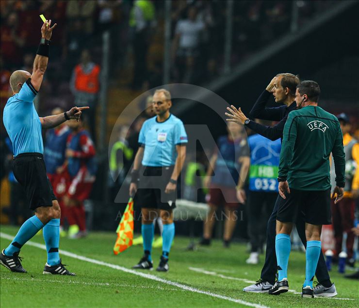 UEFA Şampiyonlar Ligi'nde Galatasaray, A Grubu'nda Fransa'nın Paris Saint-German ekibiyle Türk Telekom Stadı’nda karşılaştı. Bir pozisyondan sonra Paris Saint-German teknik direktörü Thomas Tuchel (sağ 2) karşılaşmanın hakemi Szymon Marciniak'tan sarı kart gördü. ( Salih Zeki Fazlıoğlu - Anadolu Ajansı )Salih Zeki Fazlıoğlu