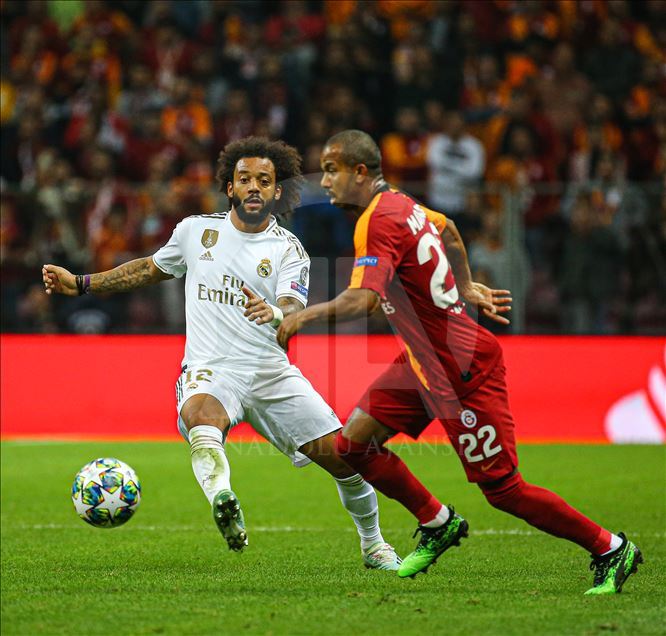UEFA Şampiyonlar Ligi'nde Galatasaray, A Grubu'nda İspanya’nın Real Madrid ekibiyle Türk Telekom Stadı’nda karşılaştı. Bir pozisyonda Galatasaraylı oyuncu Mariano (22) ile Real Madridli futbolcu Marcelo (12) mücadele etti.