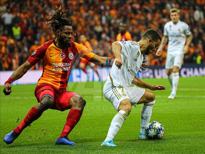 UEFA Şampiyonlar Ligi'nde Galatasaray, İspanya’nın Real Madrid takımıyla Türk Telekom Stadı’nda karşılaştı. Bir pozisyonda Galatasaraylı oyuncu Luyindama (solda) ile Real Madridli futbolcu Eden Hazard (7) mücadele etti.