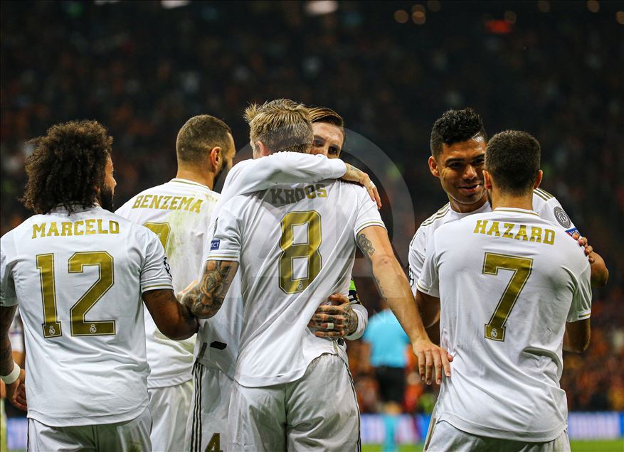 UEFA Şampiyonlar Ligi'nde Galatasaray, A Grubu'nda İspanya’nın Real Madrid ekibiyle Türk Telekom Stadı’nda karşılaştı. Real Madrid’in golünü atan Toni Kross (8) sevincini takım arkadaşlarıyla paylaştı.