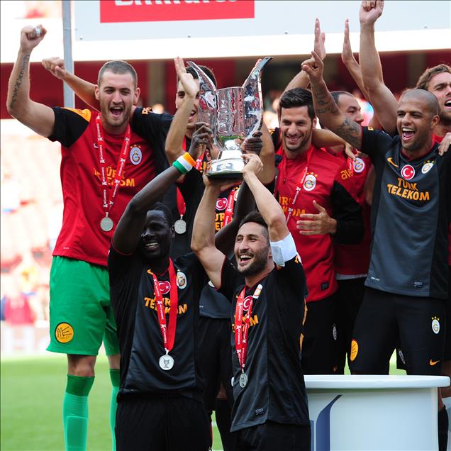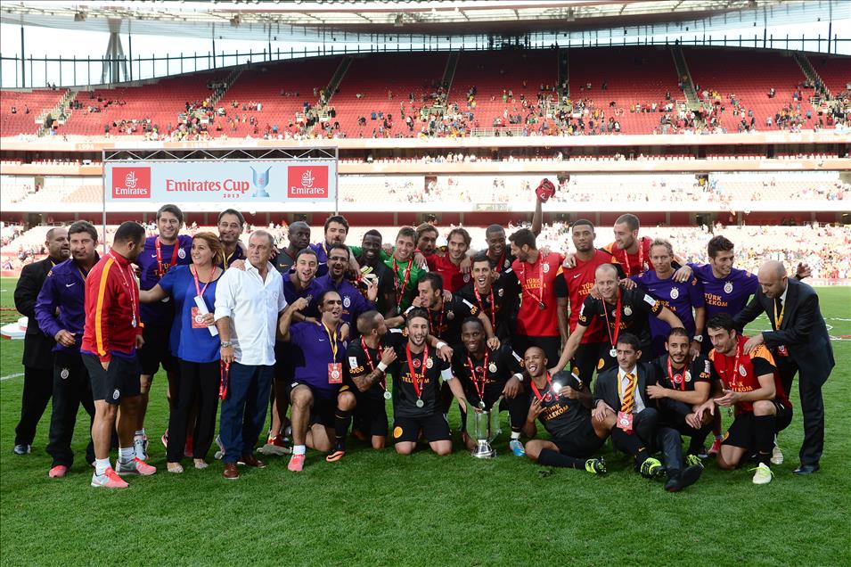 LONDON, ENGLAND - AUGUST 04: Galatasaray celebrate with the cup following victory in the Emirates Cup match between Arsenal and Galatasaray at The Emirates Stadium on August 04, 2013 in London, England (Photo by Alex Broadway)