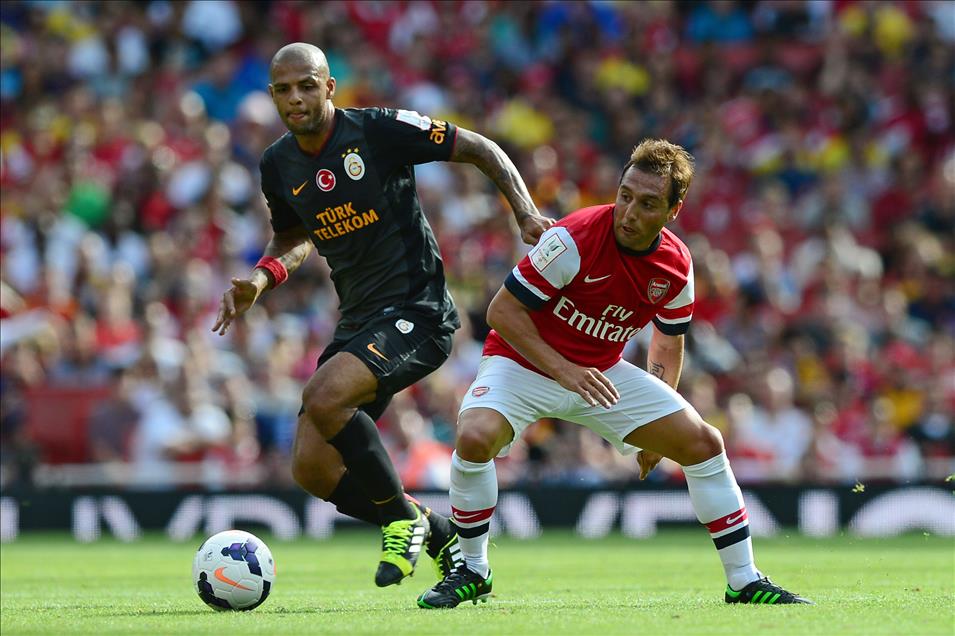 LONDON, ENGLAND - AUGUST 04: Felipe Melo of Galatasaray and Santi Cazorla of Arsenal during the Emirates Cup match between Arsenal and Galatasaray at The Emirates Stadium on August 04, 2013 in London, England (Photo by Alex Broadway)