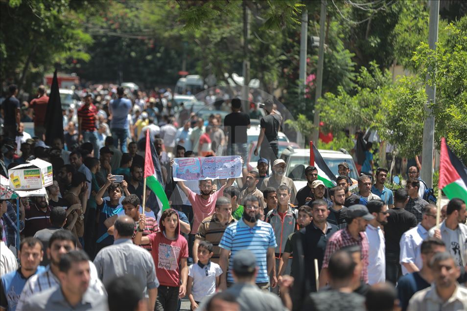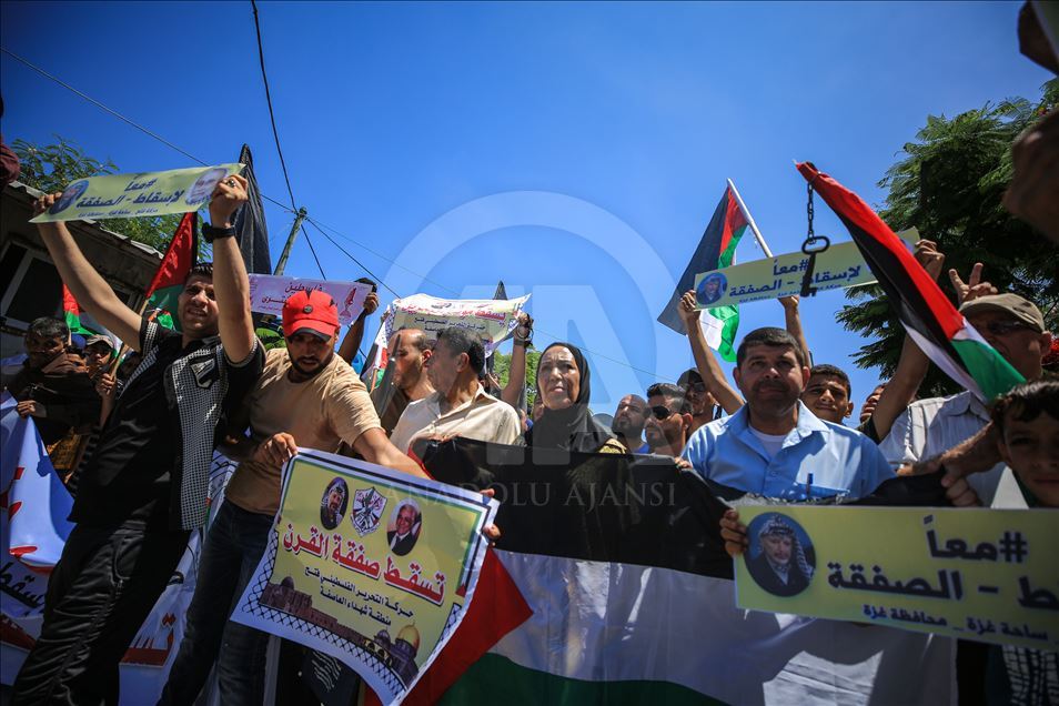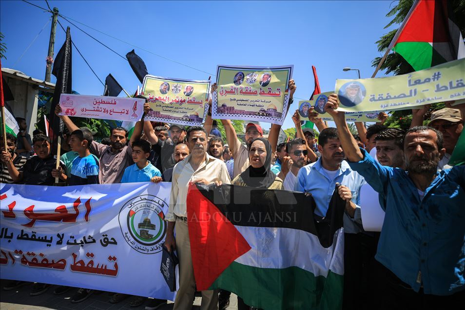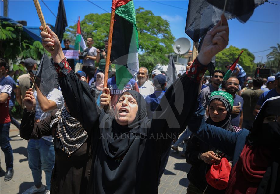 Gazze'de toplanan bir grup, "Filistin meselesinin tasfiyesini hedefleyen Yüzyılın Anlaşması planının uygulanması yolundaki ilk adım" olarak görülen Bahreyn Çalıştayı'nı protesto etti. ( Ali Jadallah - Anadolu Ajansı )Ali Jadallah