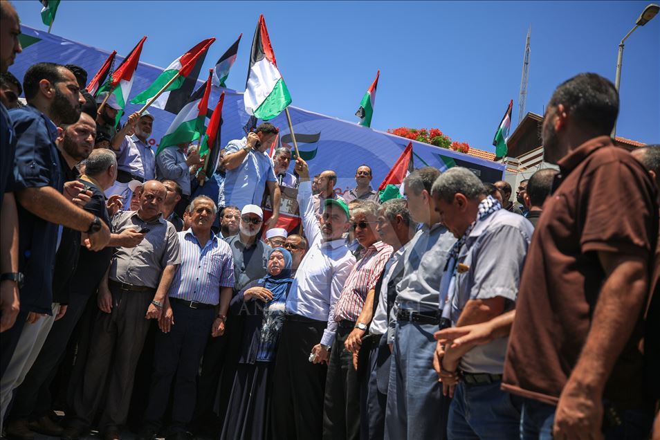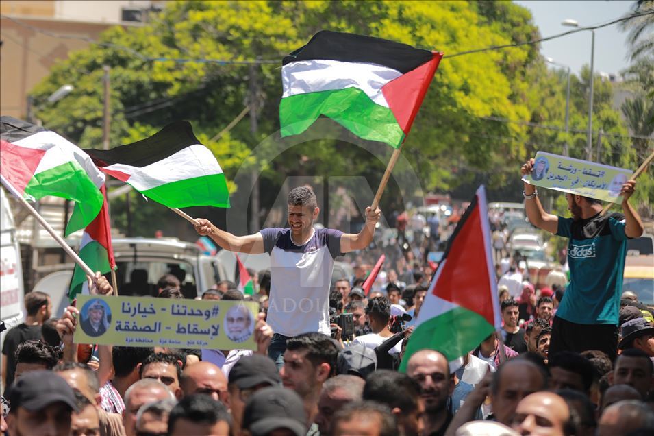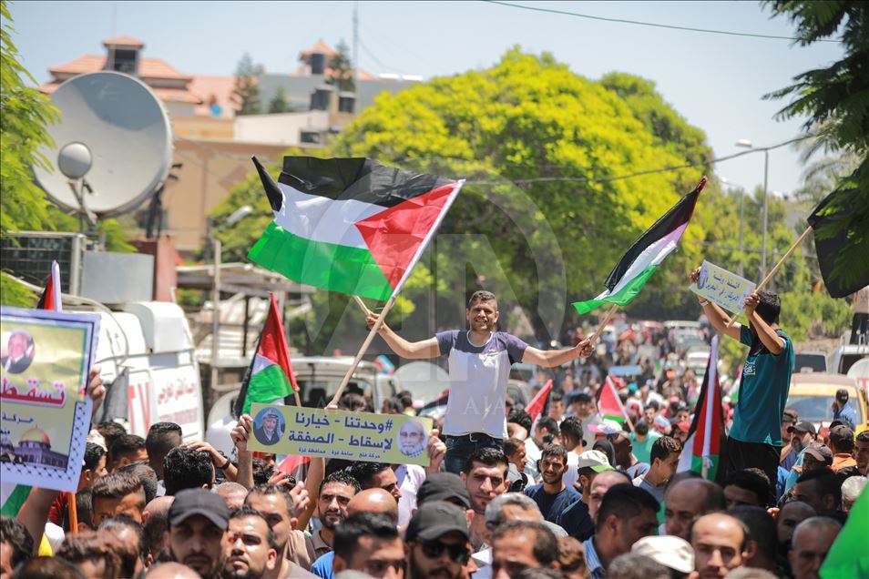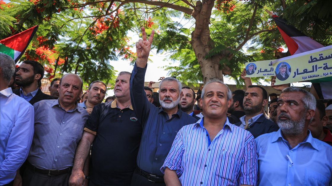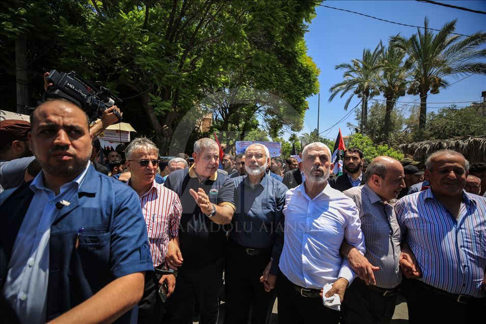 Gazze'de toplanan bir grup, "Filistin meselesinin tasfiyesini hedefleyen Yüzyılın Anlaşması planının uygulanması yolundaki ilk adım" olarak görülen Bahreyn Çalıştayı'nı protesto etti. Gösteriye, Hamas Siyasi Büro Başkanı İsmail Heniyye (sağ 4) ve Hamas'ın Gazze sorumlusu Yahya Sinvar (sağ 3) katıldı. ( Ali Jadallah - Anadolu Ajansı )Ali Jadallah