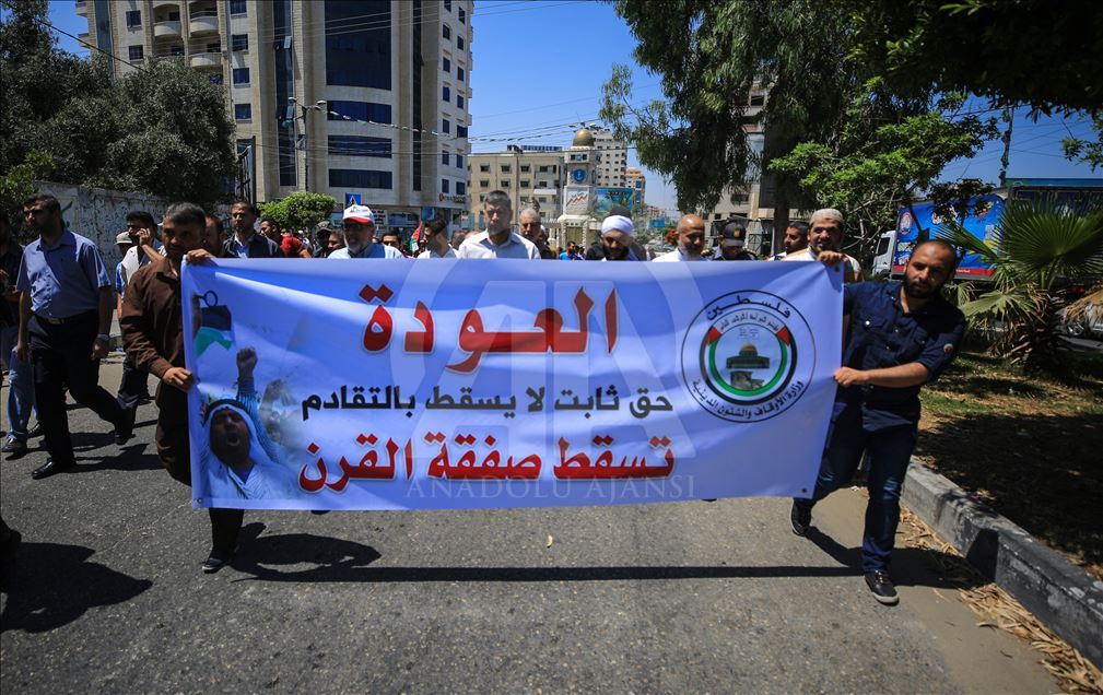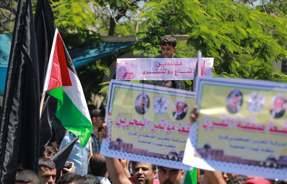 Gazze'de toplanan bir grup, "Filistin meselesinin tasfiyesini hedefleyen Yüzyılın Anlaşması planının uygulanması yolundaki ilk adım" olarak görülen Bahreyn Çalıştayı'nı protesto etti.