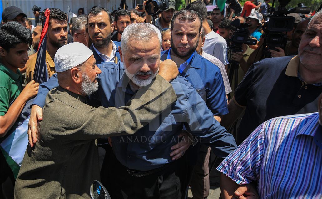 Gazze'de toplanan bir grup, "Filistin meselesinin tasfiyesini hedefleyen Yüzyılın Anlaşması planının uygulanması yolundaki ilk adım" olarak görülen Bahreyn Çalıştayı'nı protesto etti. Bir Filistinli, gösteriye katılan Hamas Siyasi Büro Başkanı İsmail Heniyye'ye sevgi gösterisinde bulundu. ( Ali Jadallah - Anadolu Ajansı )Ali Jadallah