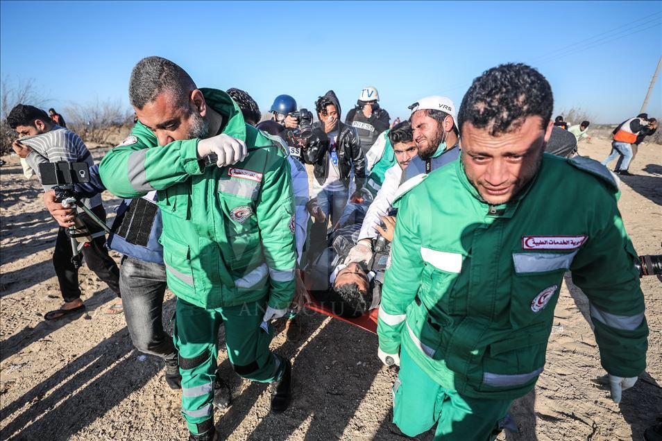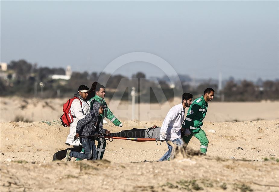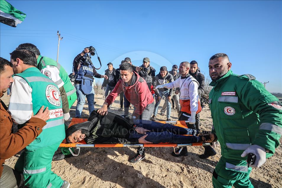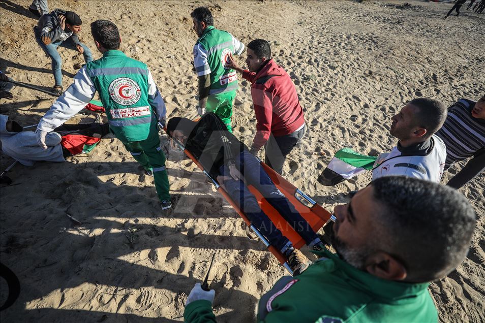 Gazze'nin kuzeyindeki Beyt Lahya kentinin İsrail sınırında toplanan Filistinliler, İsrail'in hava ve denizden uyguladığı ablukanın kaldırılması talebiyle gerçekleştirilen deniz eylemine katıldı. Sınırın diğer tarafındaki İsrail güçlerinin gösteriye müdahalesi üzerine yaralanan bir Filistinli, sağlık ekipleri tarafından bölgeden uzaklaştırıldı. ( Mustafa Hassona - Anadolu Ajansı )Mustafa Hassona