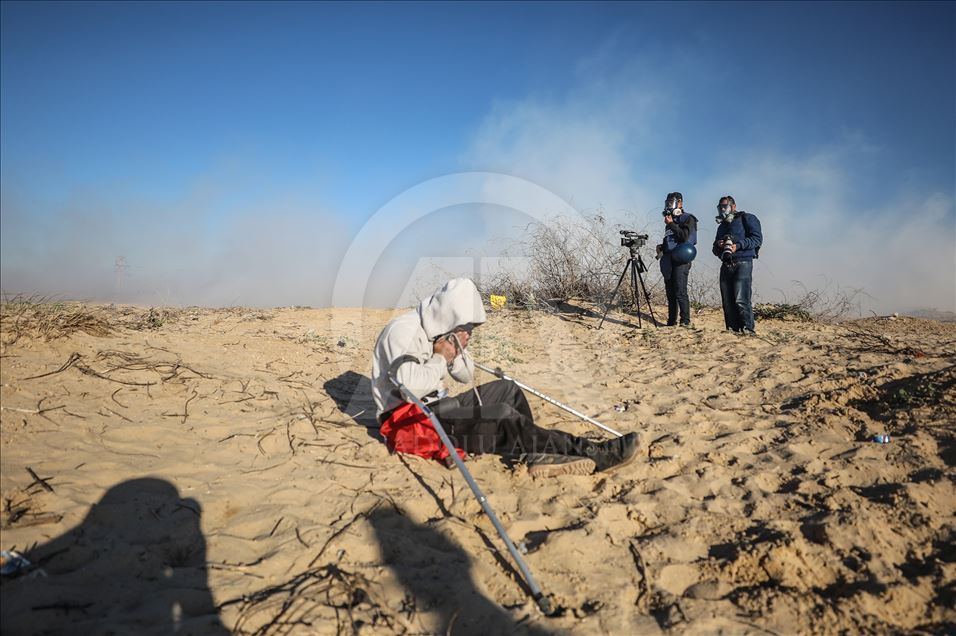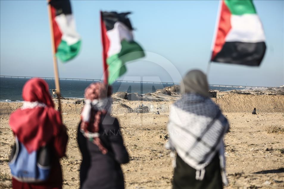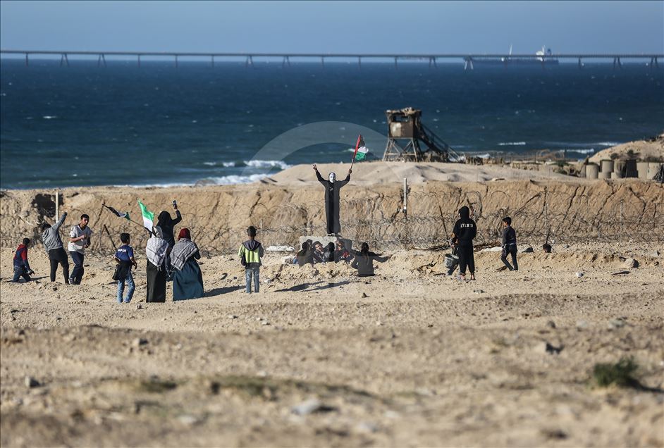 Gazze'nin kuzeyindeki Beyt Lahya kentinin İsrail sınırında toplanan Filistinliler, İsrail'in hava ve denizden uyguladığı ablukanın kaldırılması talebiyle gerçekleştirilen deniz eylemine katıldı. Sınırın diğer tarafındaki İsrail güçleri, göstericilere göz yaşartıcı gaz bombasıyla müdahale etti. ( Mustafa Hassona - Anadolu Ajansı )Mustafa Hassona