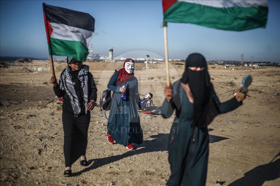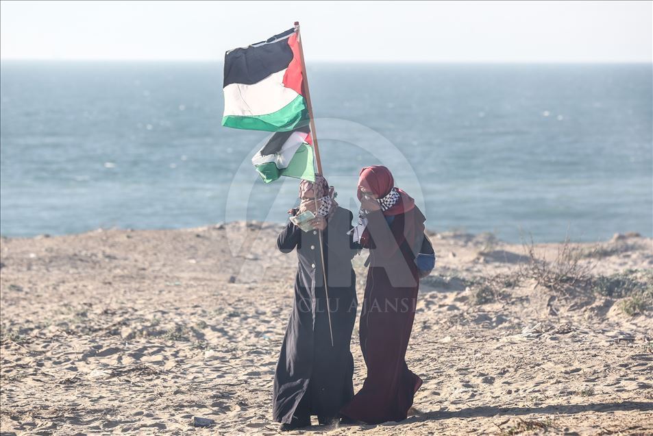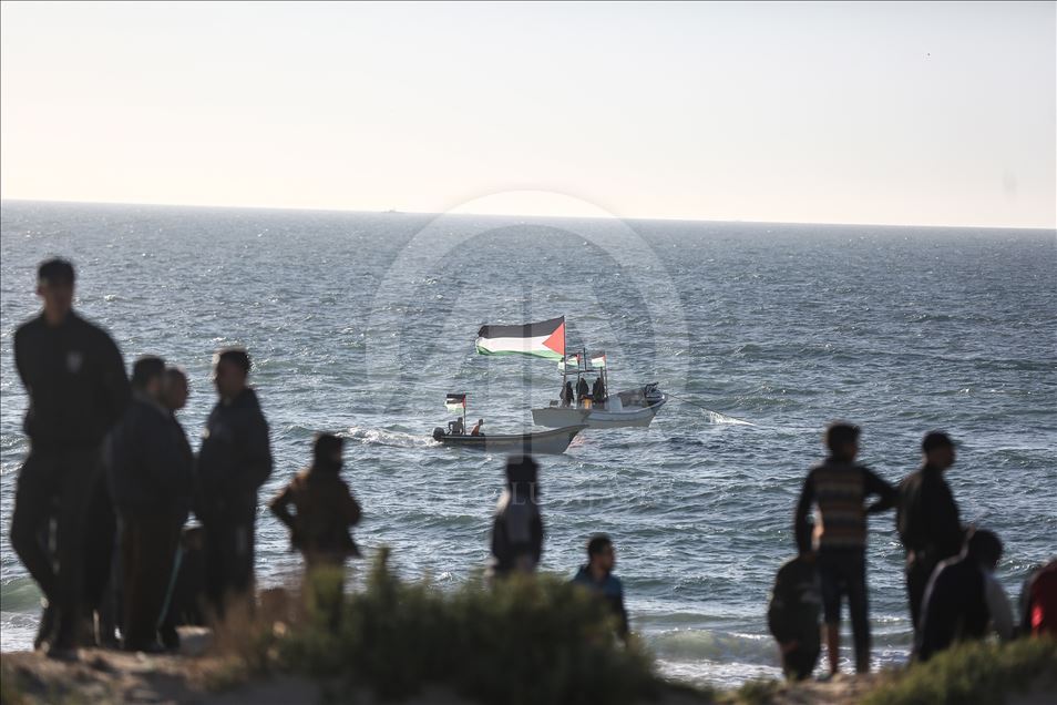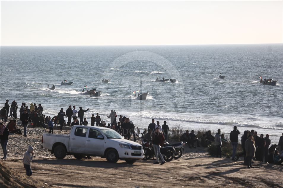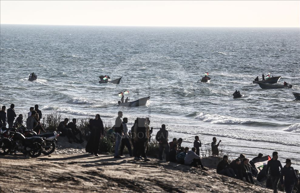 Gazze'nin kuzeyindeki Beyt Lahya kentinin İsrail sınırında toplanan Filistinliler, İsrail'in hava ve denizden uyguladığı ablukanın kaldırılması talebiyle gerçekleştirilen deniz eylemine katıldı.