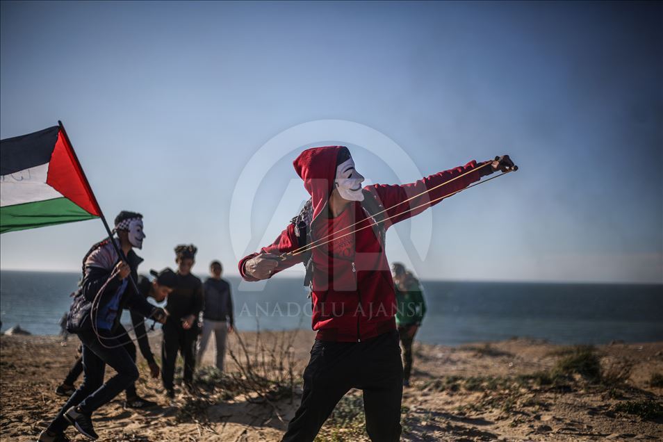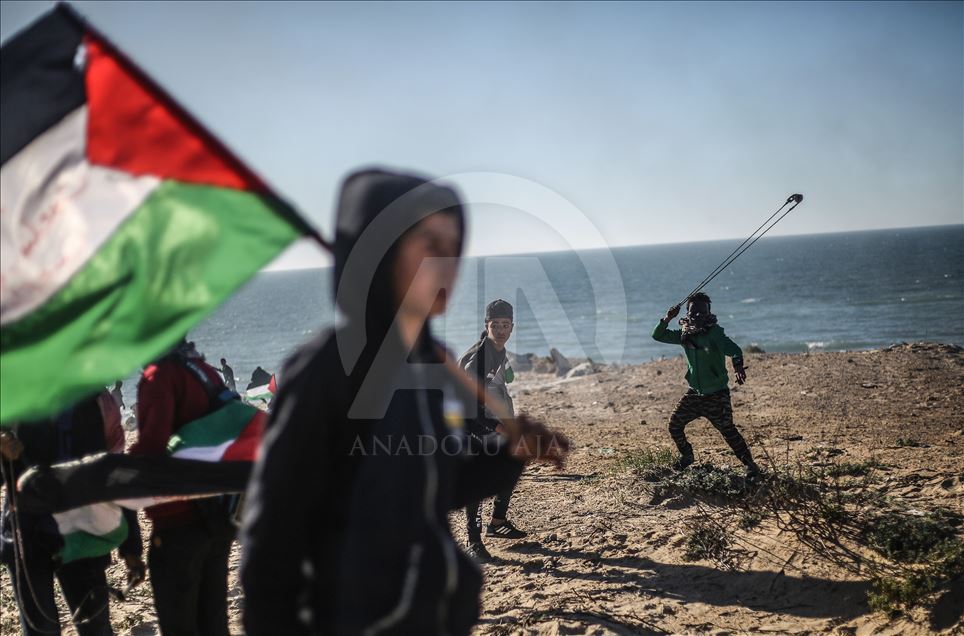 Gazze'nin kuzeyindeki Beyt Lahya kentinin İsrail sınırında toplanan Filistinliler, İsrail'in hava ve denizden uyguladığı ablukanın kaldırılması talebiyle gerçekleştirilen deniz eylemine katıldı. Sınırın diğer tarafındaki İsrail güçlerinin gösteriye müdahalesi üzerine Filistinliler, sapanla taş atarak karşılık verdi. ( Mustafa Hassona - Anadolu Ajansı )Mustafa Hassona