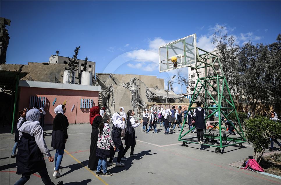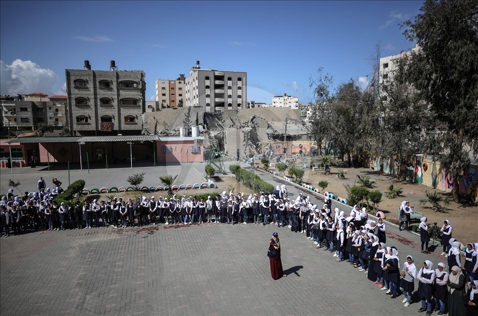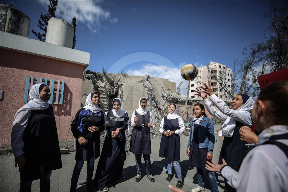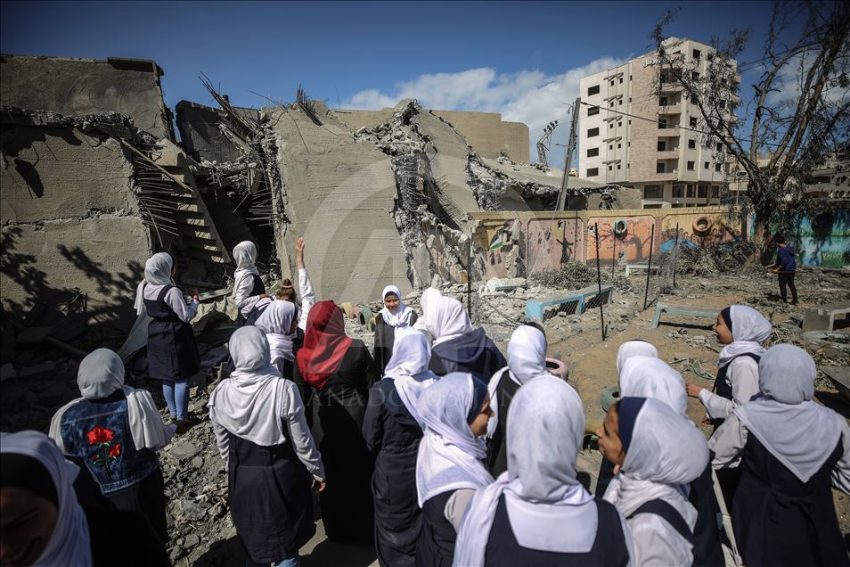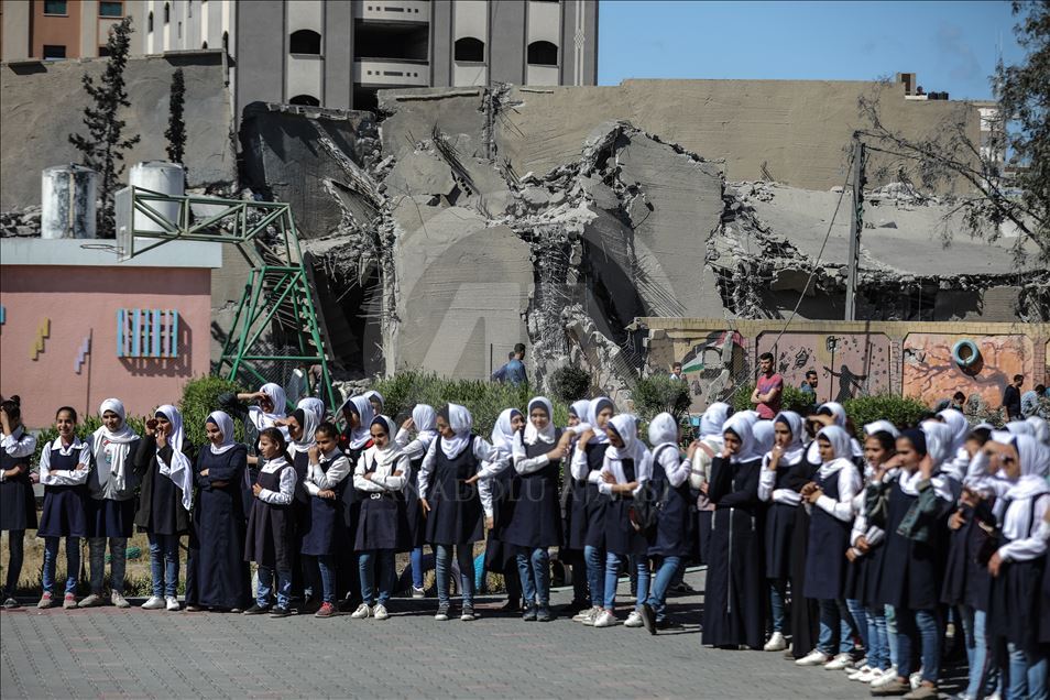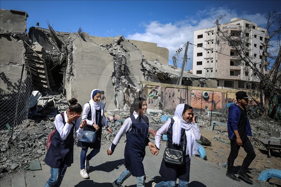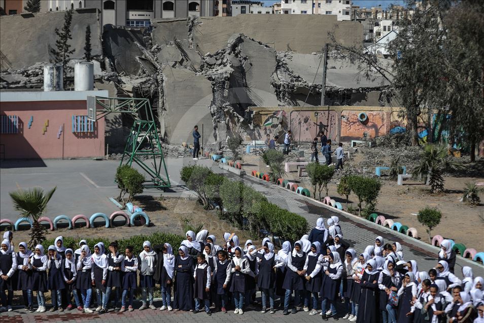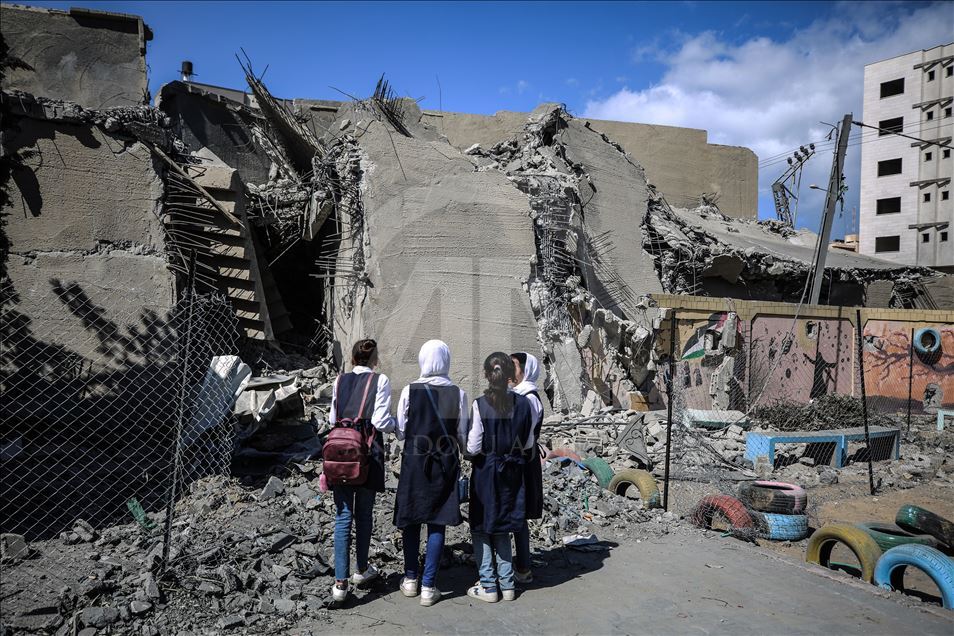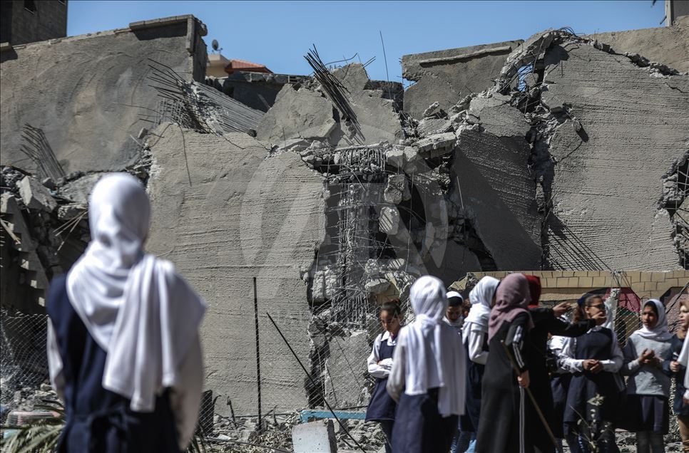 İsrail’in hafta sonu Gazze Şeridi'ne düzenlediği saldırılarda, sivillerin yaşadığı Gazze kentindeki Burc el Kamar apartmanı yıkılırken, yakınındaki Seyyide Rukayya Kız Okulunun duvarları da hasar gördü. Öğrenciler, yıkıntıların bitişiğindeki okul bahçesinde eğitimlerine devam ediyor. ( Ali Jadallah - Anadolu Ajansı )Ali Jadallah