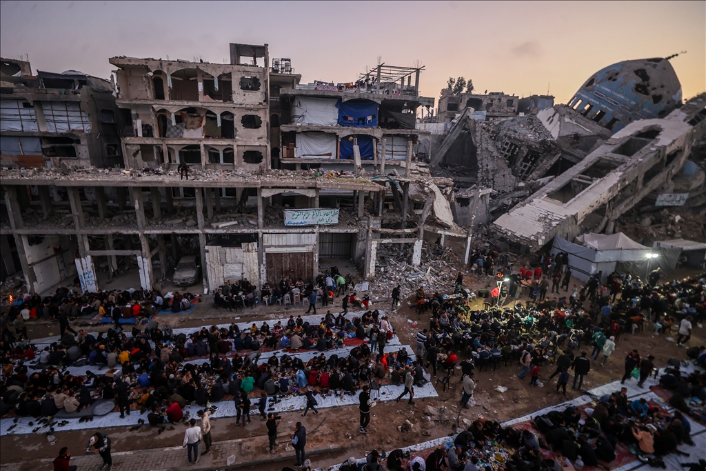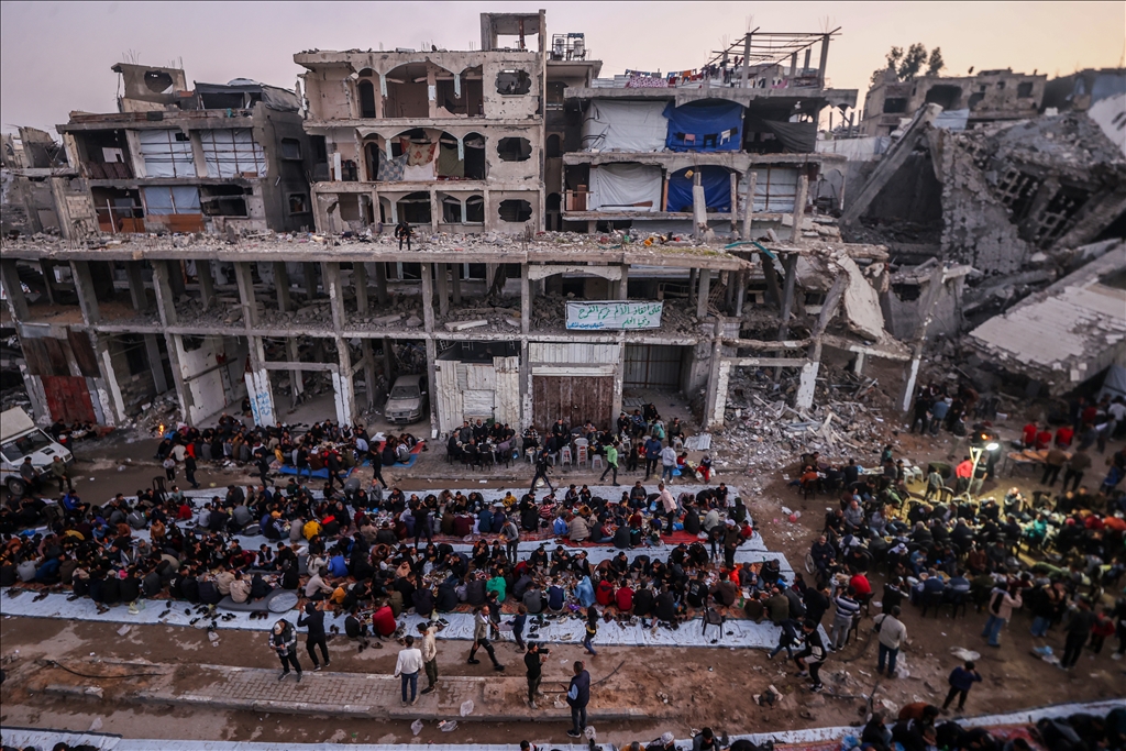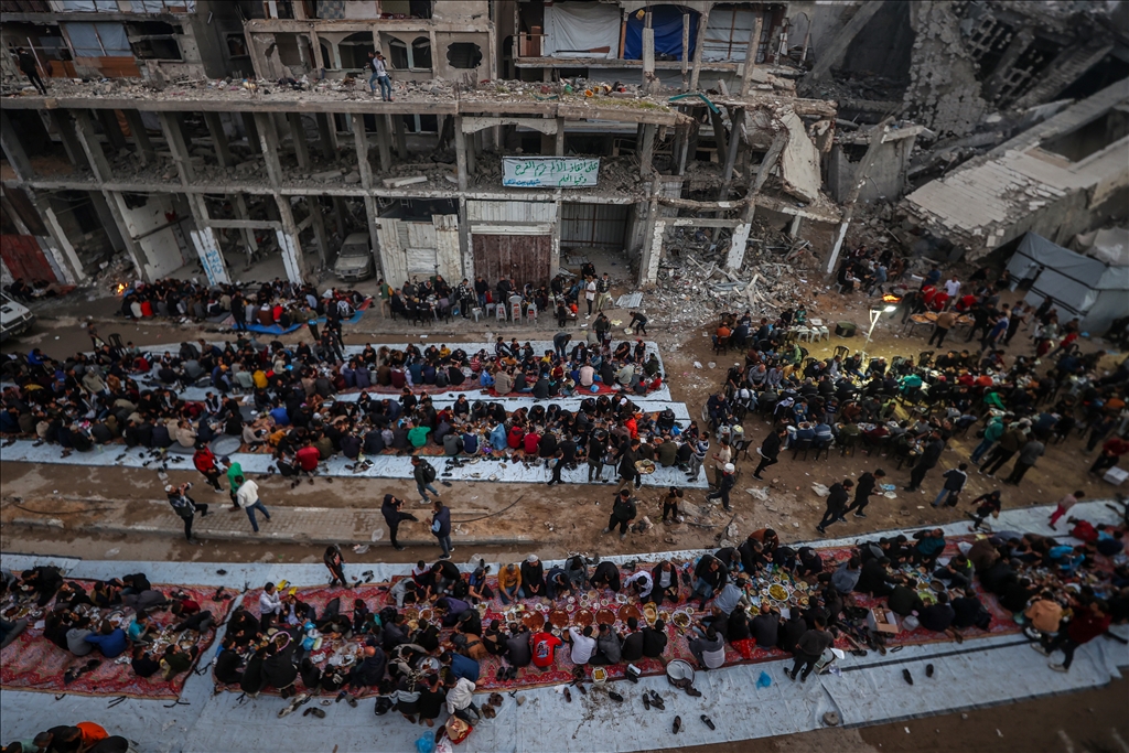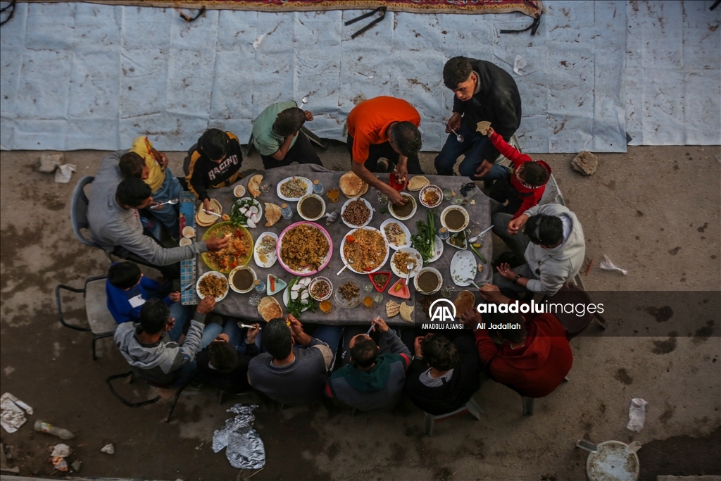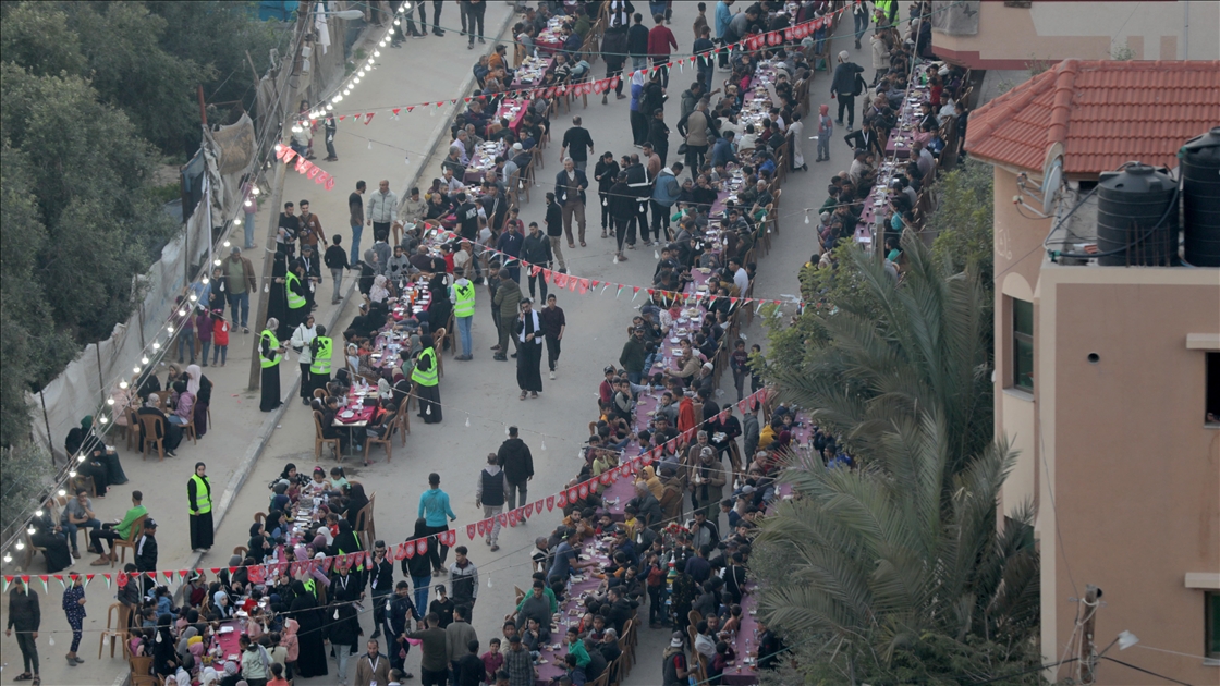 İsrail saldırılarında evleri yıkılan Gazze Şeridi'nin kuzeyindeki Beyt Lahiya kenti sakinleri, Ramazan ayında dayanışmayı artırmak amacıyla yıkıntılar arasında toplu iftar yaptı. "Beyt Lahiya Toplumu" adıyla düzenlenen iftar etkinliğinde yüzlerce Filistinli bir araya geldi. (Ali Jadallah - Anadolu Ajansı)Ali Jadallah