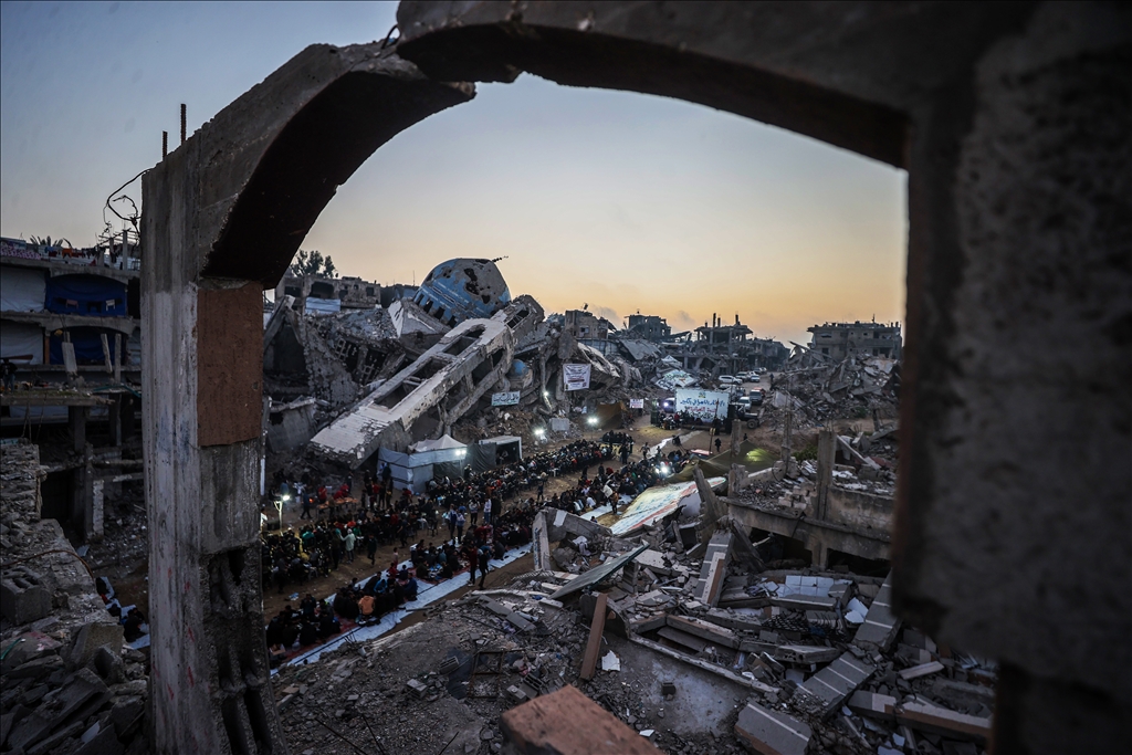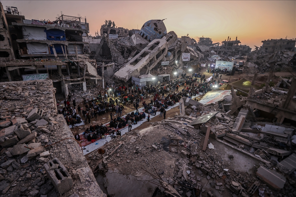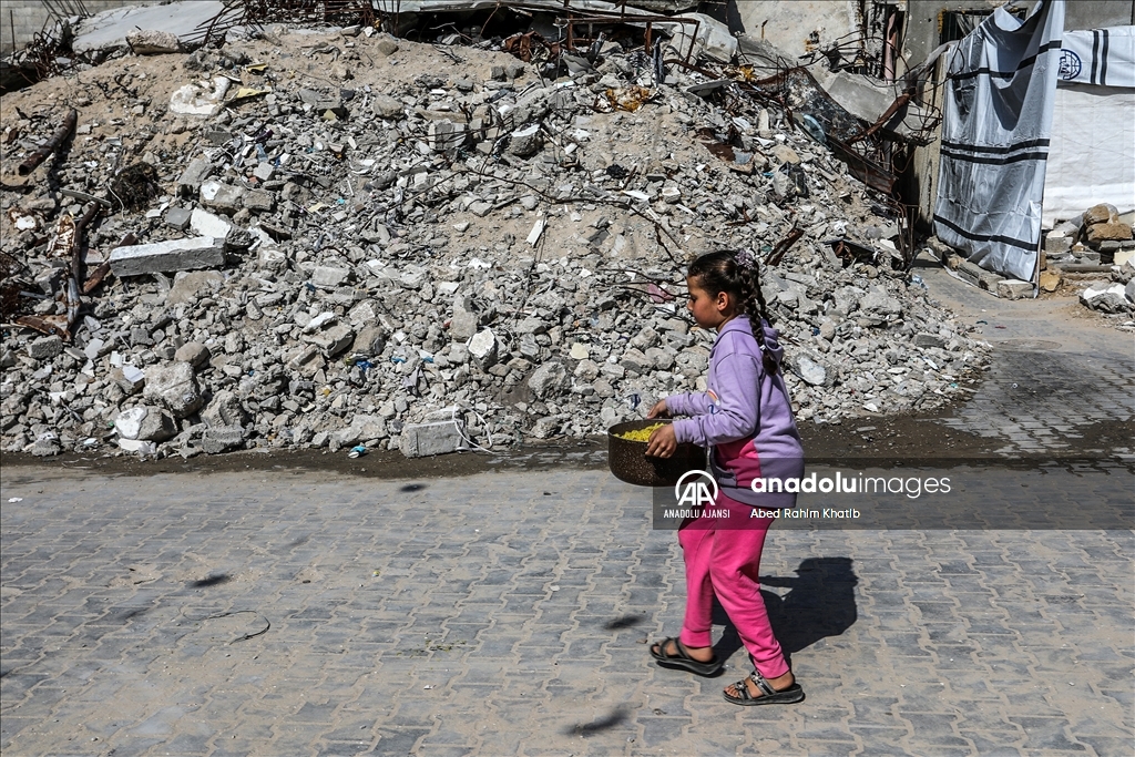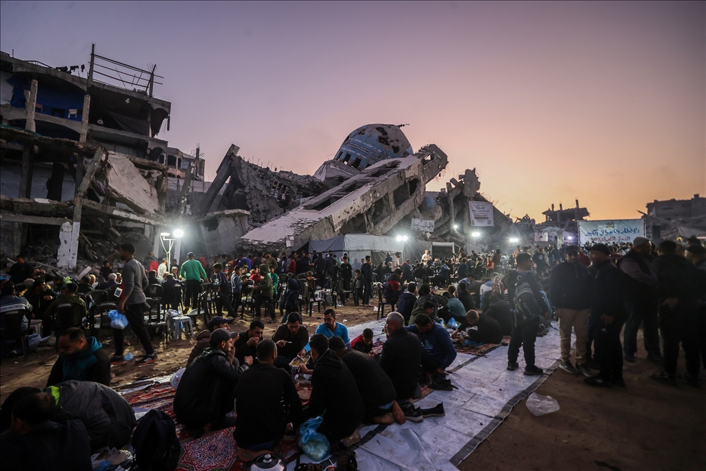 İsrail saldırılarında evleri yıkılan Gazze Şeridi'nin kuzeyindeki Beyt Lahiya kenti sakinleri, Ramazan ayında dayanışmayı artırmak amacıyla yıkıntılar arasında toplu iftar yaptı. "Beyt Lahiya Toplumu" adıyla düzenlenen iftar etkinliğinde yüzlerce Filistinli bir araya geldi. (Ali Jadallah - Anadolu Ajansı)Ali Jadallah