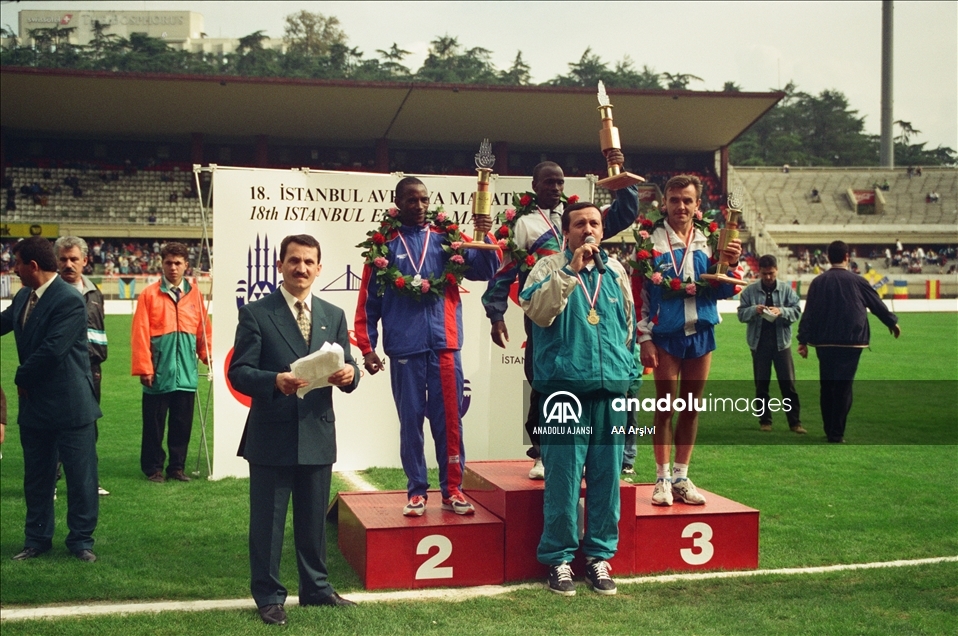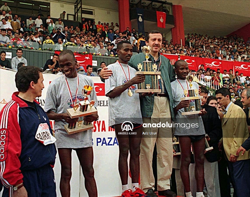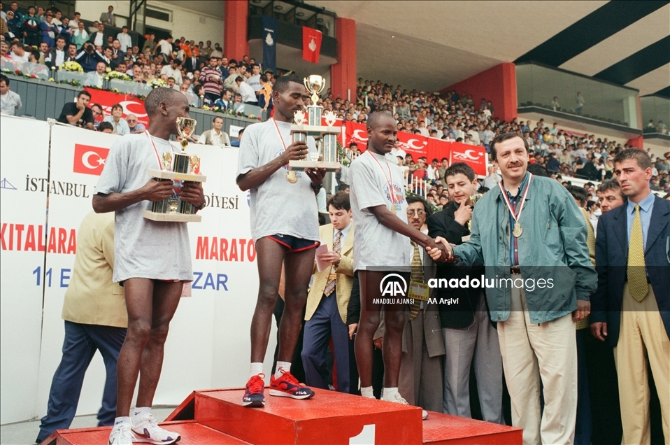 Dünyanın kıtalararası koşulan tek maratonu" unvanını taşıyan Dünya Atletizm Birliği (World Athletics) tarafından "altın kategori"de gösterilen maraton 43. kez gerçekleştirilecek. 11 Ekim 1998'de 25. koşulan Avrasya Maratonu'nda dereceye girenlere ödülleri dönemin İstanbul Büyükşehir Belediye Başkanı Recep Tayyip Erdoğan tarafından verilmişti. (Arşiv) ( AA Arşivi - Anadolu Ajansı )AA Arşivi