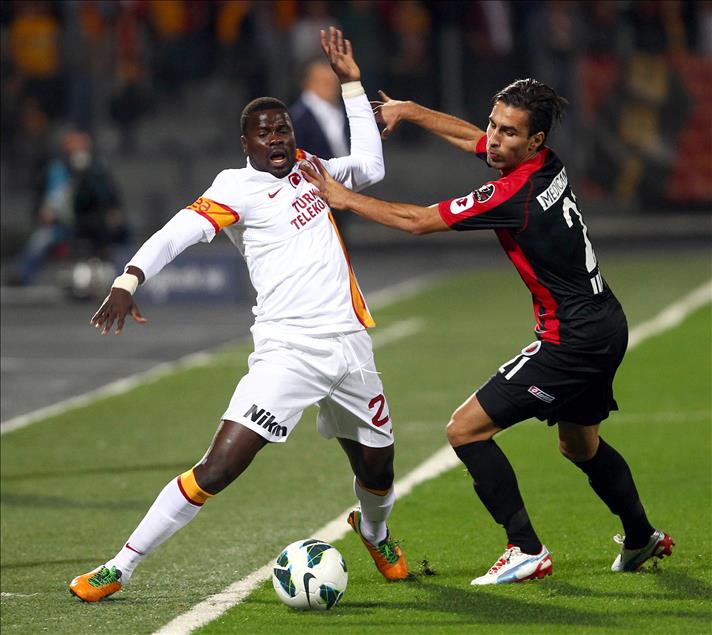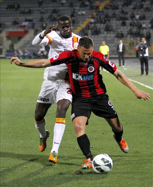 SPOR TOTO SUPERLIGI'NDE GENLERBIRLIGI ILE GALATASARAY ANKARA 19 MAYIS STADINDA KARSILASTI. BIR POZISYONDA GALATASARAYLI FUTBOLCU EBOUE ILE GENCLERBIRLIGINDEN TOSIC MUCADELE ETTI. (ANADOLU AJANSI - ENDER ONUR) (20121019)ENDER ONUR