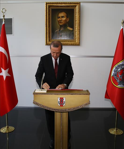 Cumhurbaşkanı Recep Tayyip Erdoğan, Genelkurmay Başkanlığı Karargahı'nda Atatürk Kültür Sitesindeki komuta devir-teslim törenine katıldı. Cumhurbaşkanı Erdoğan, Genelkurmay Başkanlığı Şeref Defteri'ni imzaladı. (Kayhan Özer - Anadolu Ajansı)Kayhan Özer