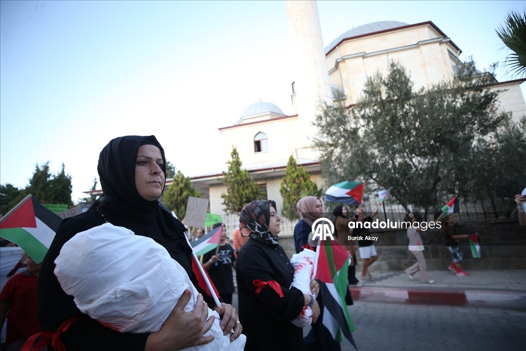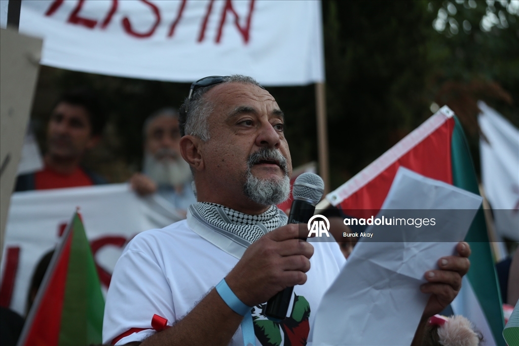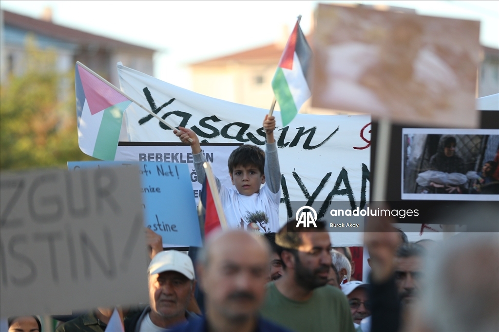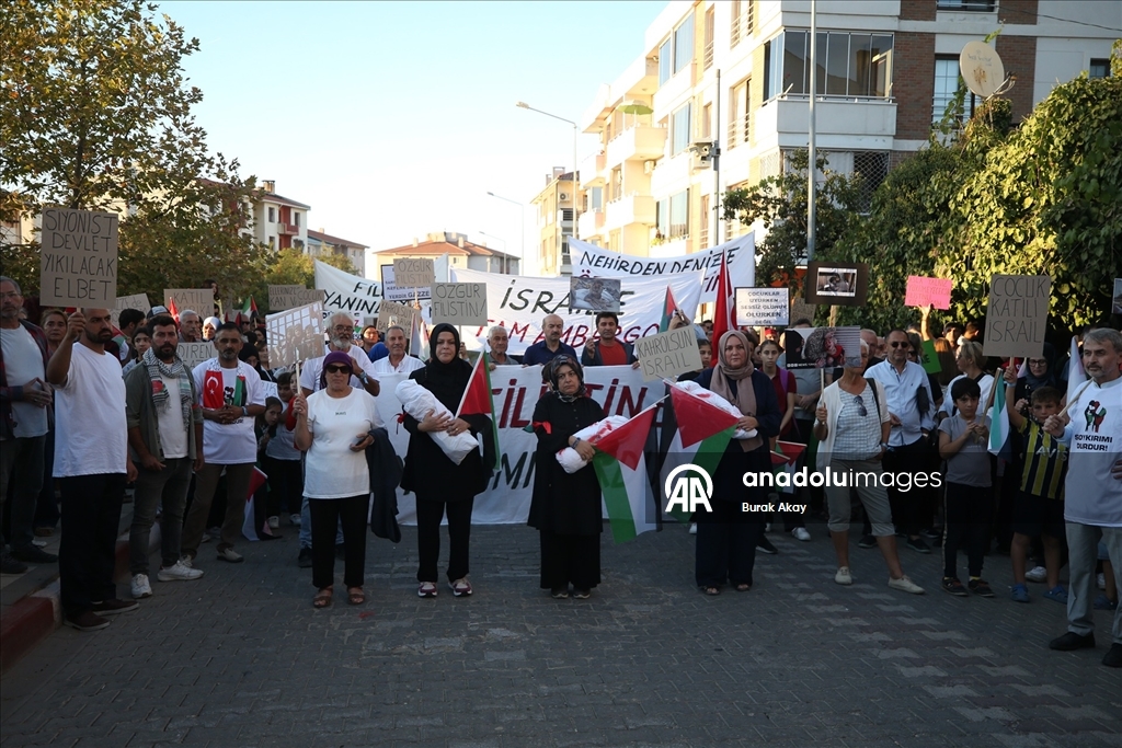 İnönü Caddesi'nde toplanan vatandaşlar, Filistin bayrakları açarak ve Gazze'de hayatını kaybedenlerin fotoğraflarının yer aldığı pankartları taşıyarak ilçe merkezine yürüdü. (Burak Akay - Anadolu Ajansı)Burak Akay