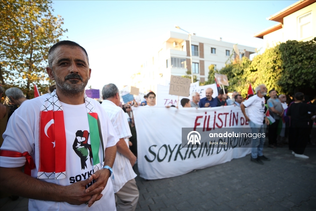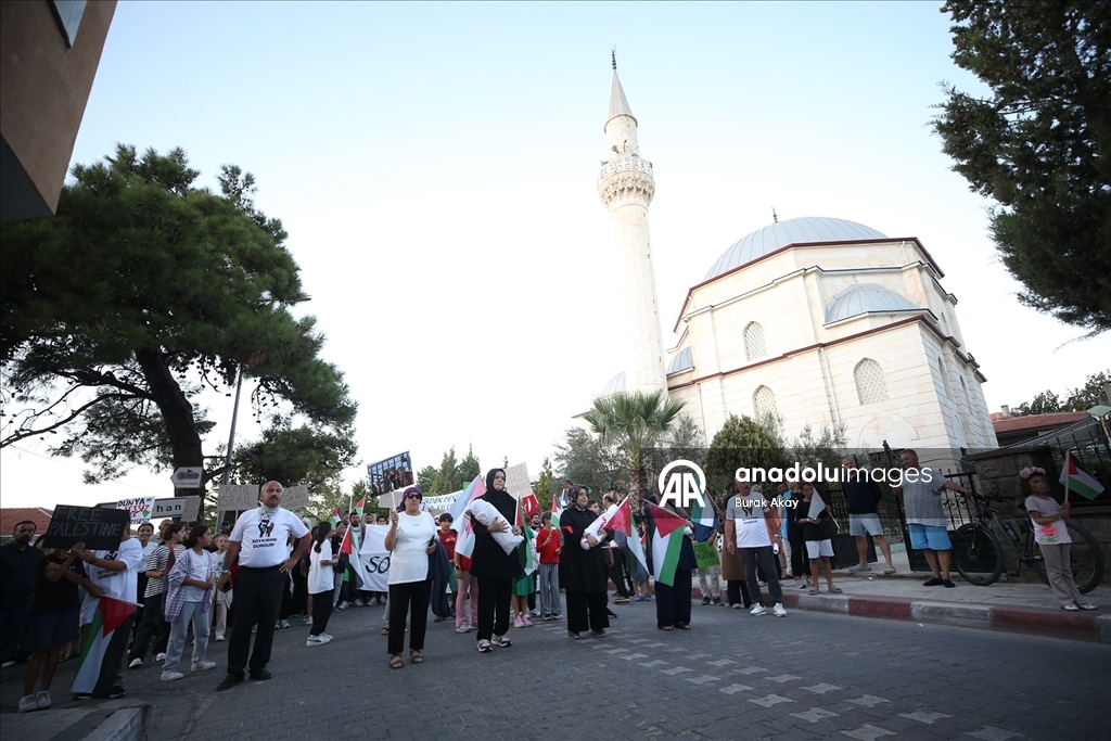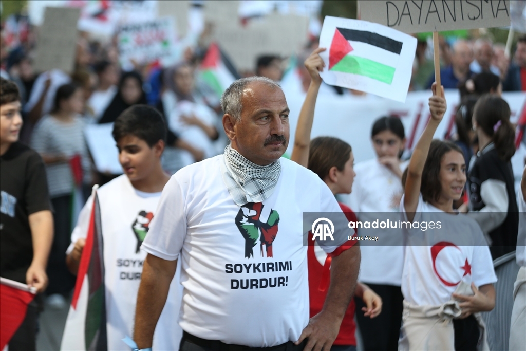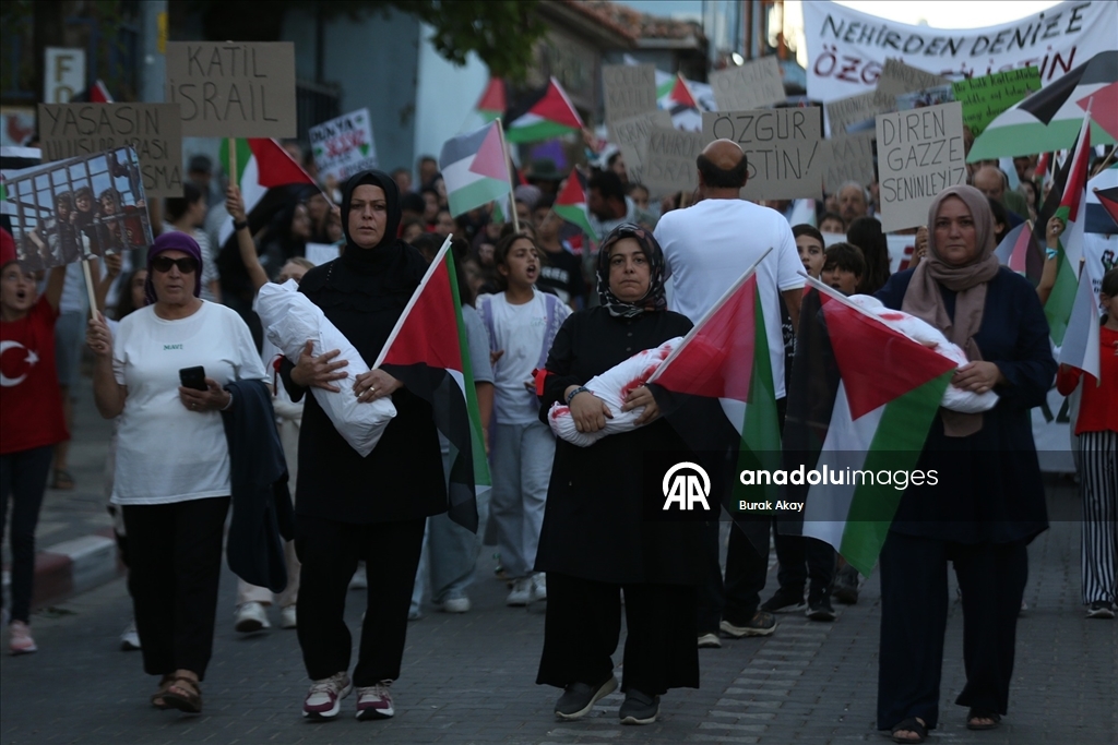 Türkiye'nin en büyük adası olan Çanakkale'nin Gökçeada ilçesinde bir araya gelen binlerce kişi, İsrail'in Filistin'e karşı yürüttüğü soykırımı protesto etti.