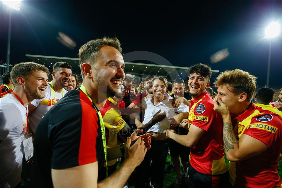 Spor Toto Süper Lig’in son haftasında Göztepe ile MKE Ankaragücü, İzmir Bornova Stadı’nda karşılaştı. Müsabakada rakibini 2-1 mağlup eden Göztepe, ligde kalmayı başardı. Karşılaşma sonrası Göztepe Teknik Direktörü Tamer Tuna (ortada) futbolcularla birlikte sevinç yaşadı. ( Emin Mengüarslan - Anadolu Ajansı )Emin Mengüarslan